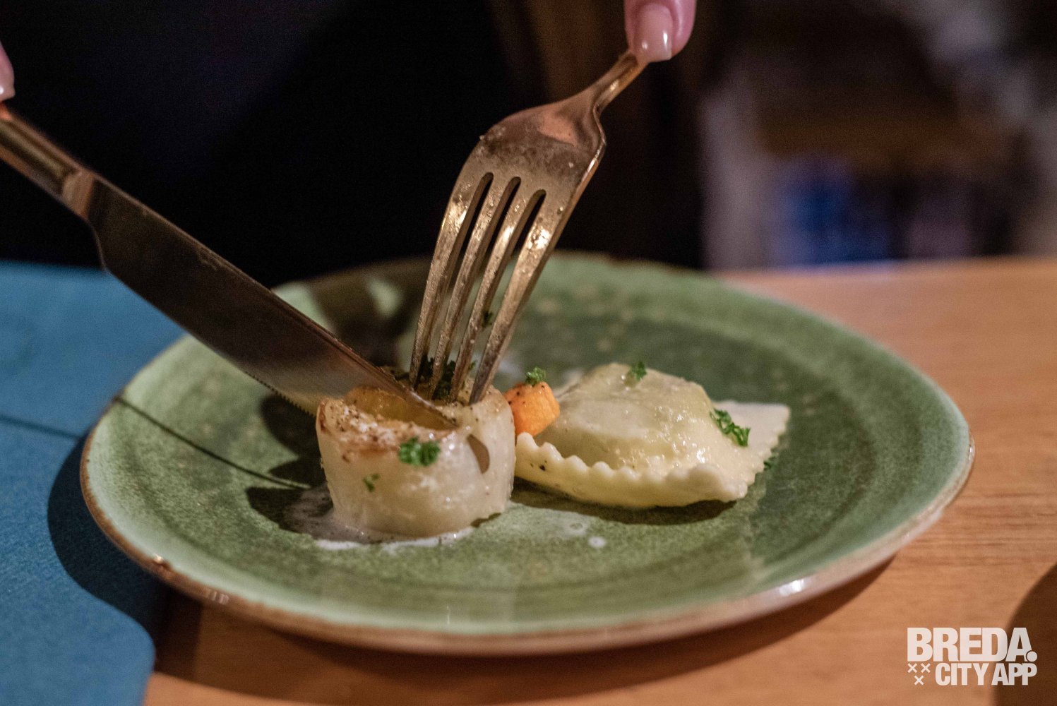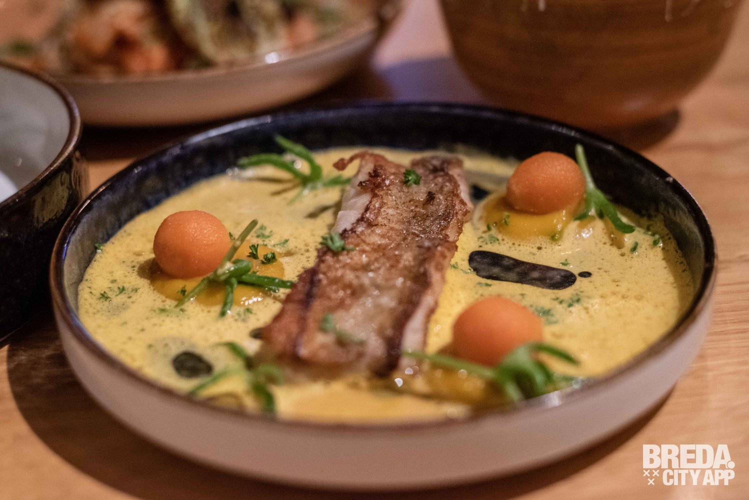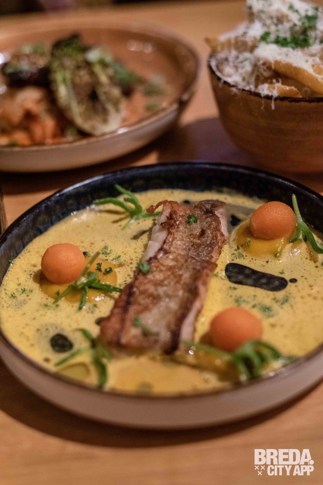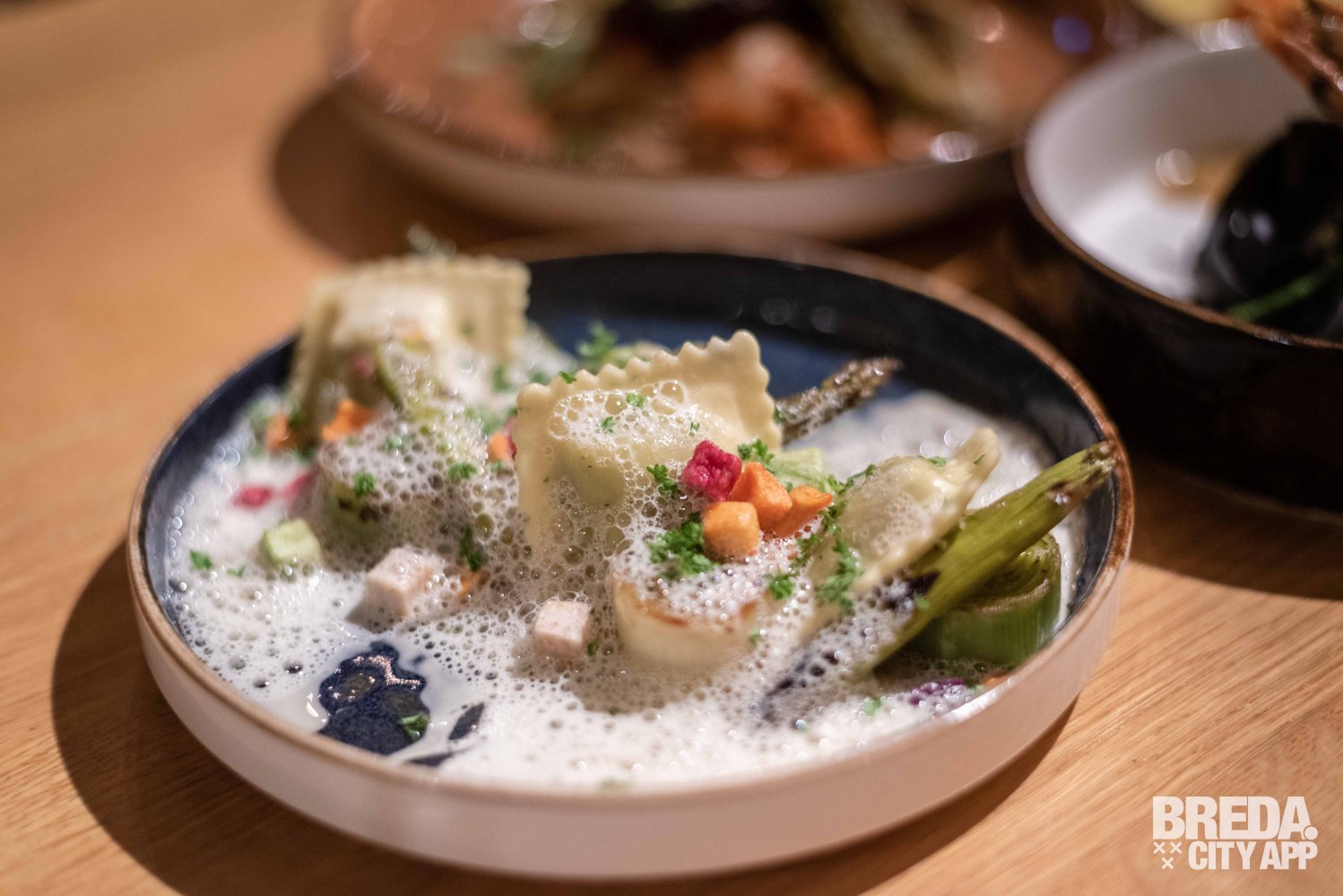 De combinatie van de gamba met langoustineschuim is zo'n gerecht waar je nog over napraat, echt een succes! De ravioli van ricotta met gegrilde asperges en schuim van knoflook is zacht en de verschillende texturen zorgen voor een mooie combinatie. Daarnaast worden er frietjes met parmezaanse kaas en truffelmayo geserveerd, daar kun je uiteraard geen nee tegen zeggen.