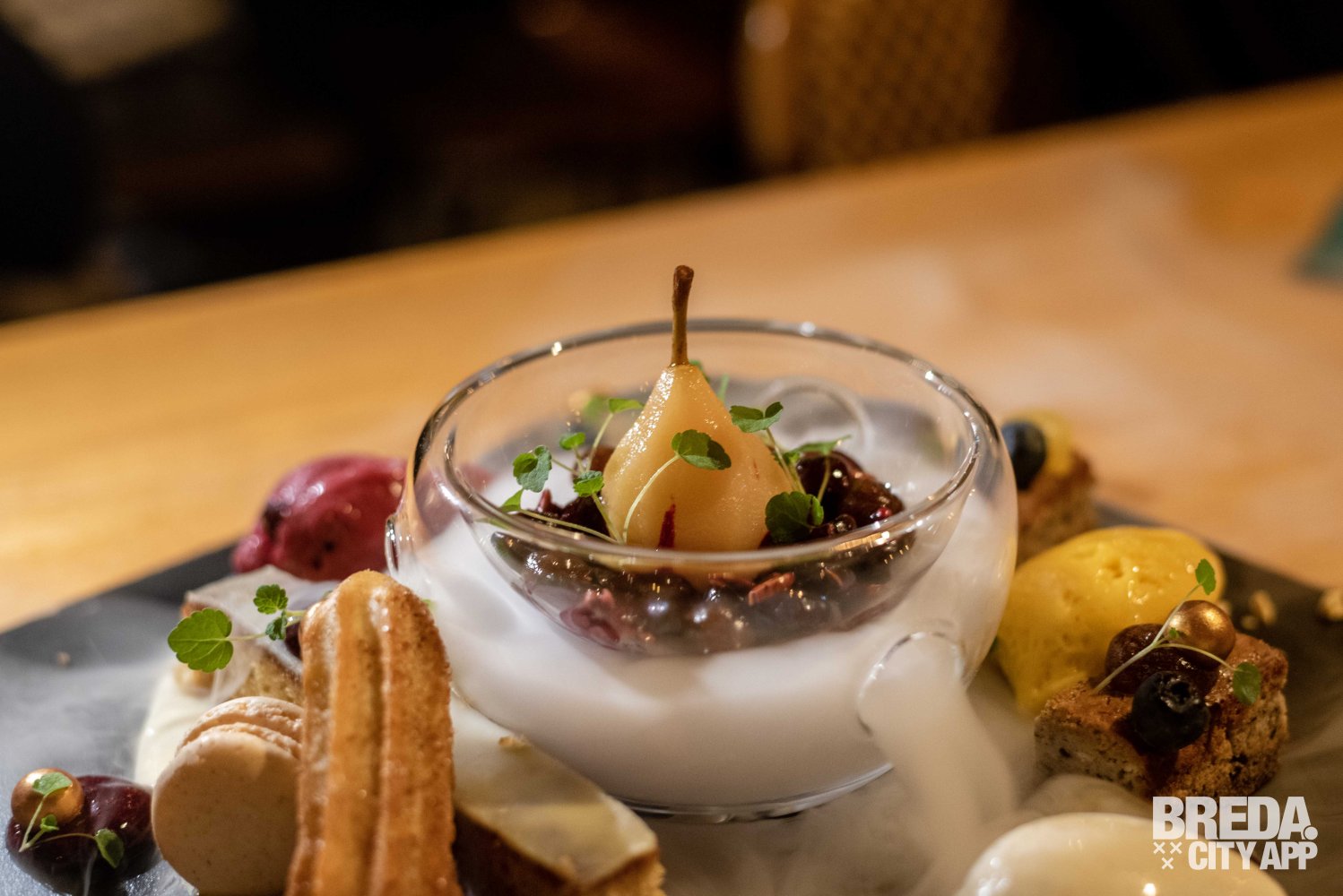 We eindigen deze avond met een grand dessert. Een prachtig, kleurrijk plateau met een proeverij van verschillende desserts: Oreo cheesecake, een chocoladebrownie met sinaasappelstoofpeer, chocolade Churros, een spannende Pornstar Martini malva (passievruchtcake met vanillesabayon - aanrader!) met daarnaast ijs van vanille, mango, sorbet van passievrucht én zwarte bes. Het zoete plateau waar rook vanaf komt (door gebruik van droogijs) is een spectaculaire ervaring voor het oog. Je kunt je ogen er niet af houden. Naast het feit dat dit plateau er prachtig uitziet, smaken alle kleine desserts van dit grand dessert ook heerlijk! De ultieme afluister van dit diner.