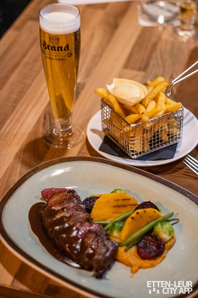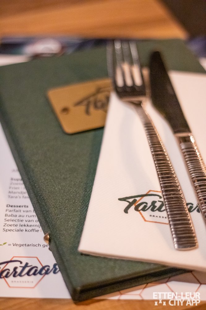 Brasserie Tartaar staat bekend om zijn steak tartaar en dat willen we proeven. Ze vertelt dat ze een wild menu hebben. Terwijl wij het menu bekijken wordt er een mooi glaasje brandbier geserveerd. Brasserie Tartaar is de enige van de horeca uitbaters in Etten-Leur die Brand op de tap heeft.