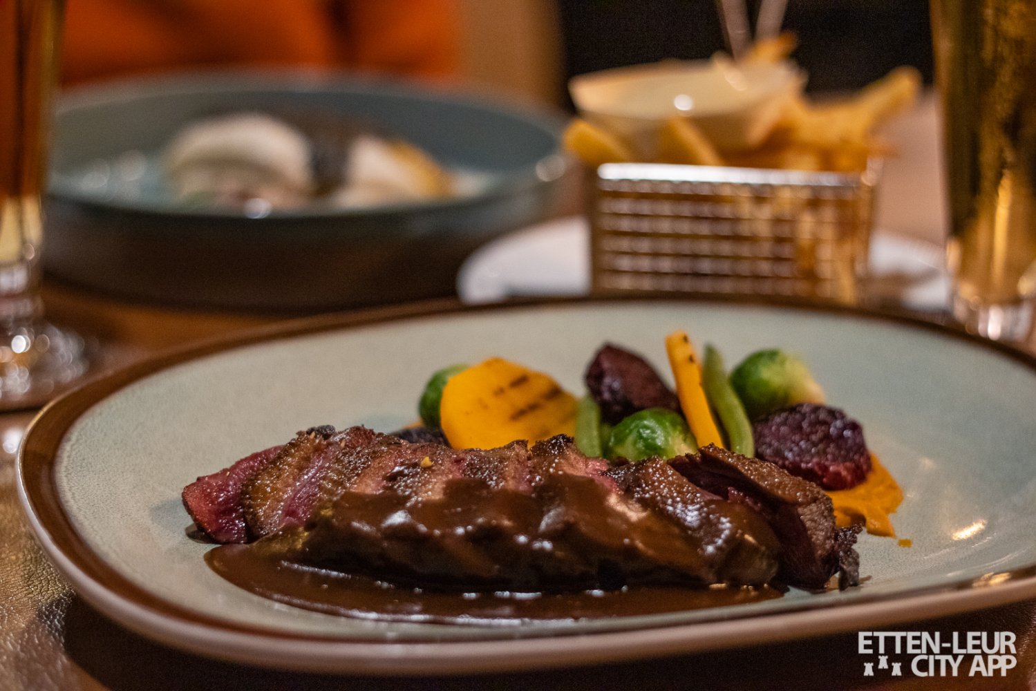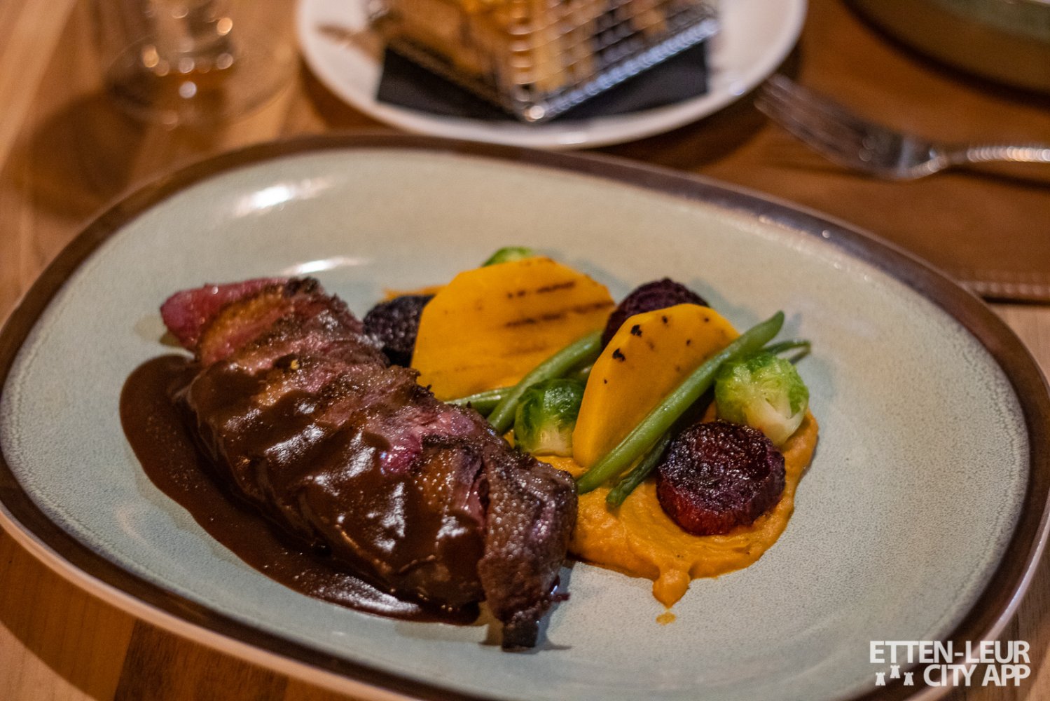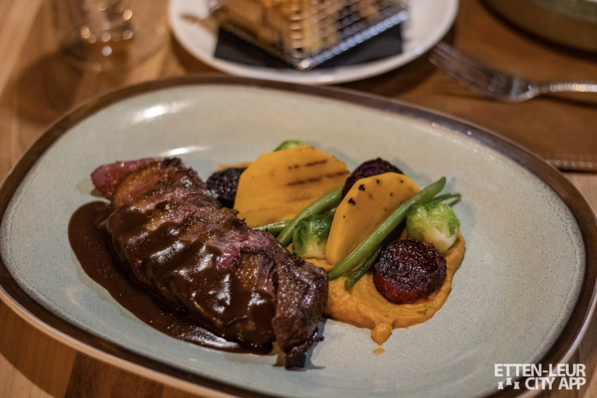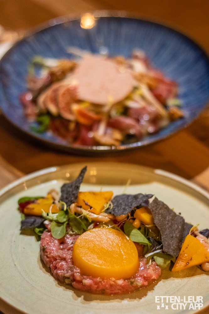 De steak tartaar brasserie-style en het voorgerecht van het wild menu: wild zwijn met eendenlever mousse, worden samen geserveerd. De steak tartaar was prima op temperatuur en we herkennen een subtiel vleugje honing. Wat een heerlijk gerecht is dit en terecht dat zij hier trots op zijn. De wildzwijn met eendenlever mousse is rijk aan smaken, de chutney van vijgen gaf het gerecht een zoete tint wat de smaken mooi bij elkaar brengt.
