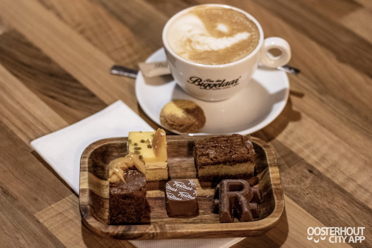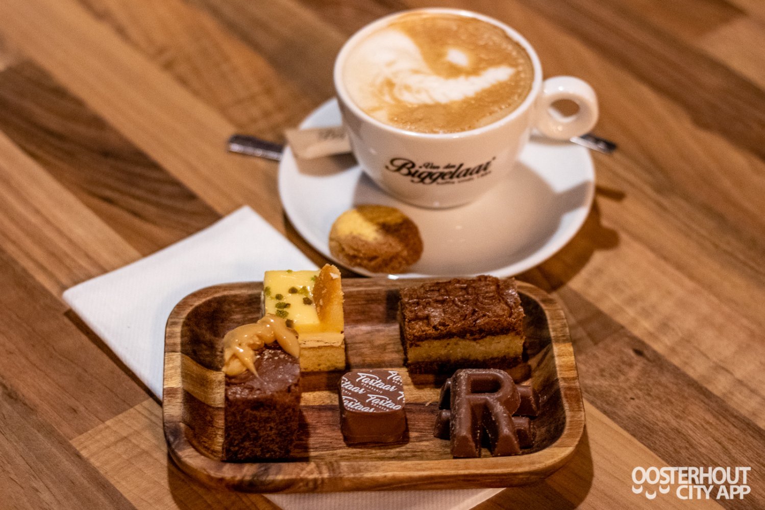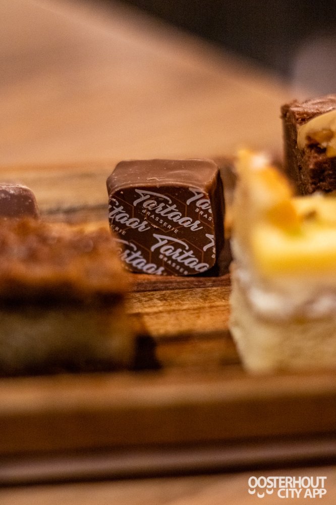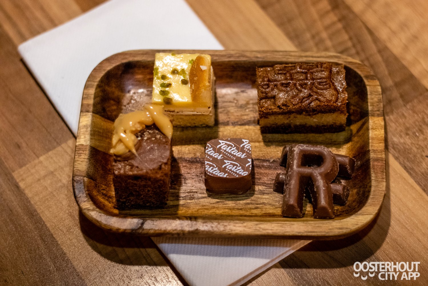 Op het plankje met lekkernijen zien wij een gevulde speculaas, mini chocolade letters, brownie, een citroen taartje en een bonbon gemaakt van Etten-Leurs likeur, het moeierboompke. Dit maakte ons bezoek compleet en het 3-gangen menu tot z’n einde.