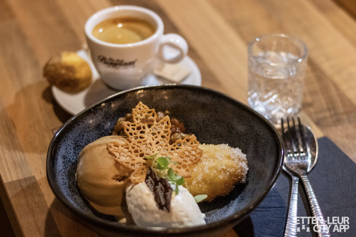 Tot slot sluiten wij ons bezoek af met een cappuccino met “5 lekkernijen” en een espresso met Baba au rum. Baba au rum is een crème van kardemom, boerenjongens en een cake gedrenkt in rum met daarnaast een quenelle van mokka-ijs. Een ware traktatie voor de liefhebber.