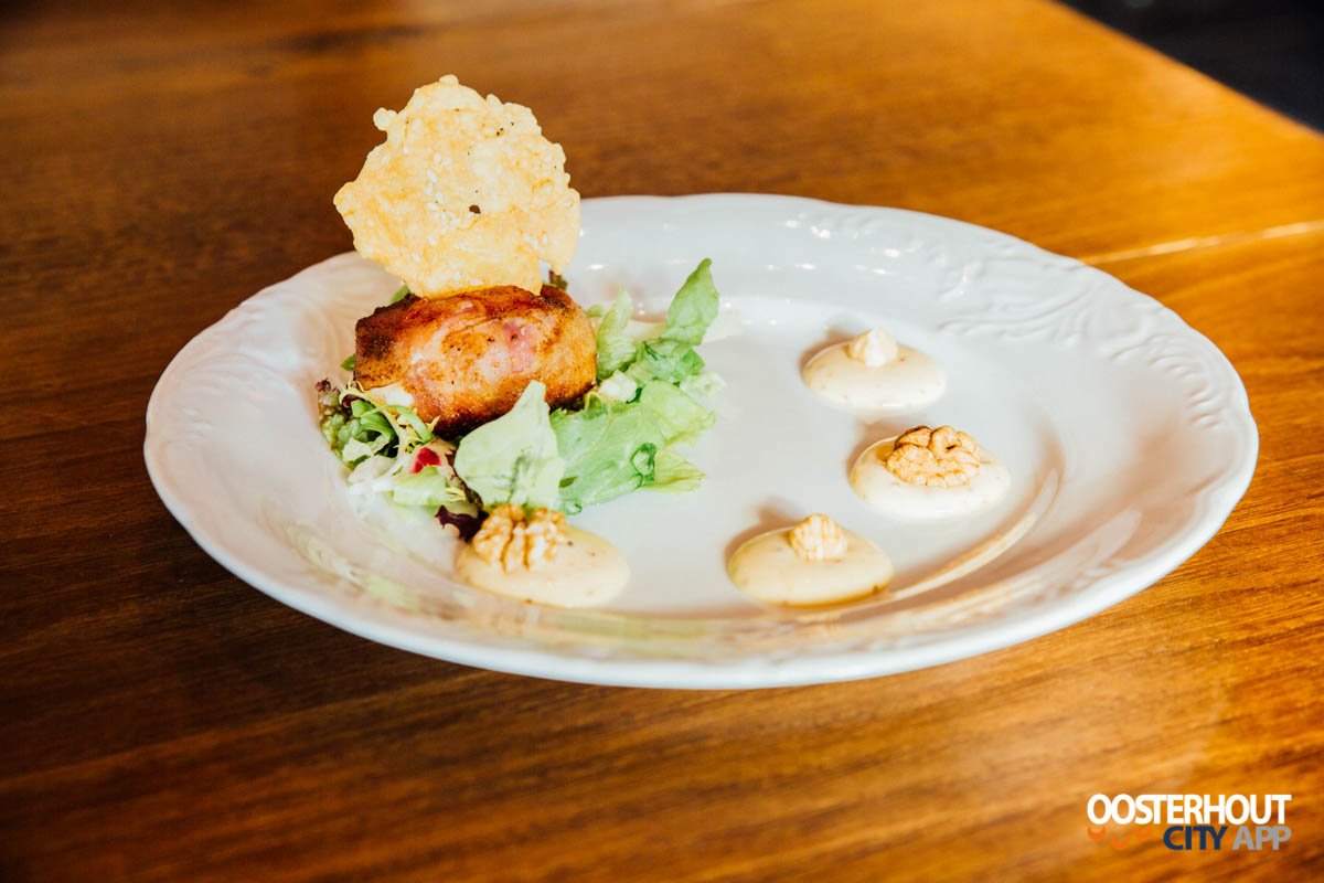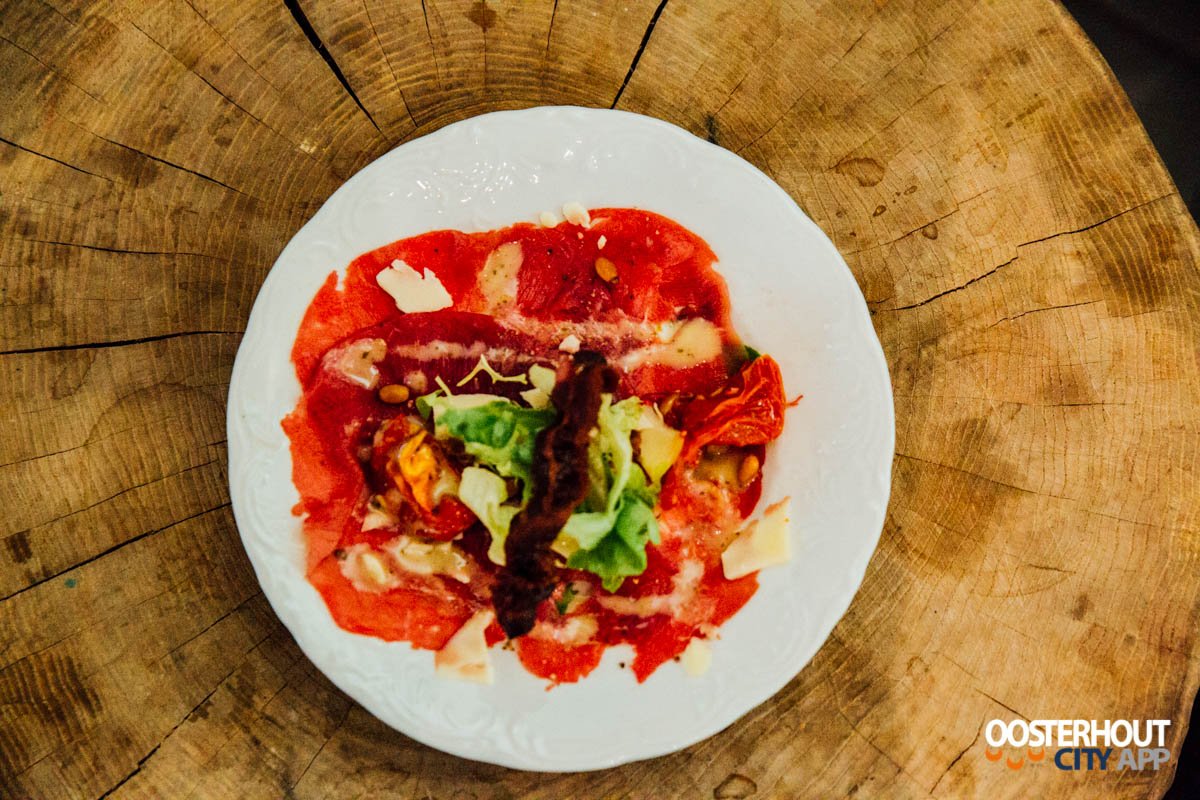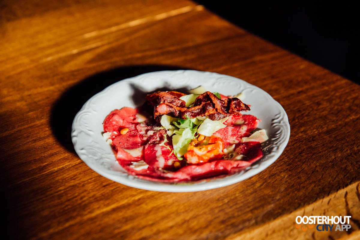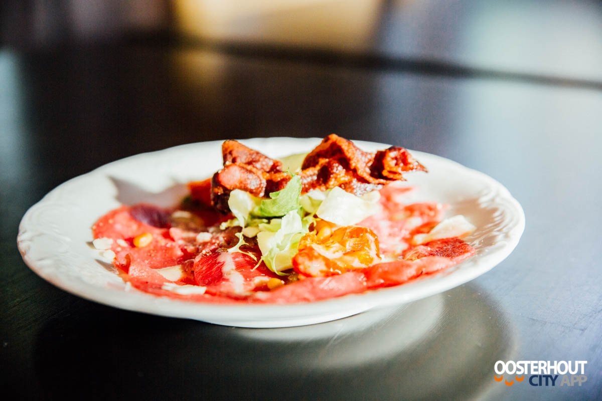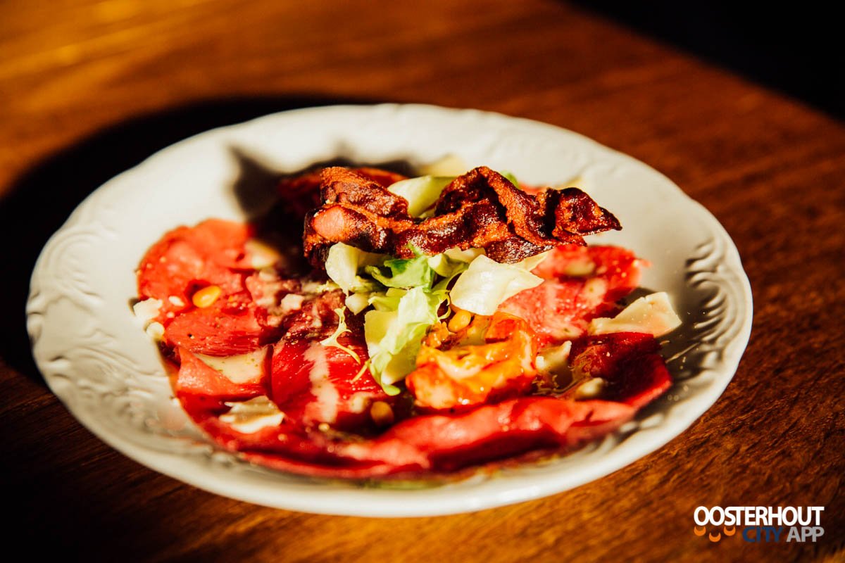 De malse rundercarpaccio is mooi dungesneden en wordt vergezeld van Parmezaanse kaas, zongedroogde tomaatjes en een smakelijke pestodressing. De gedroogde spekjes geven dit gerecht een mooie bite.