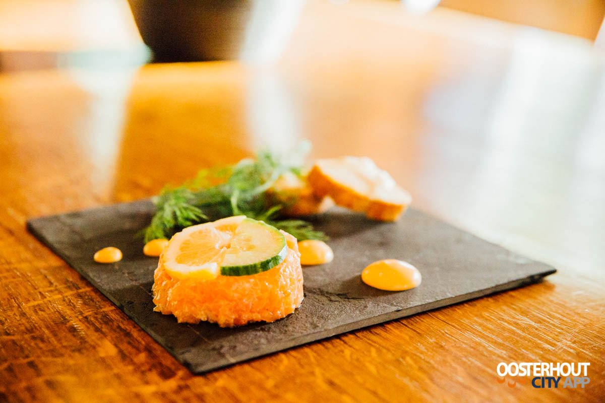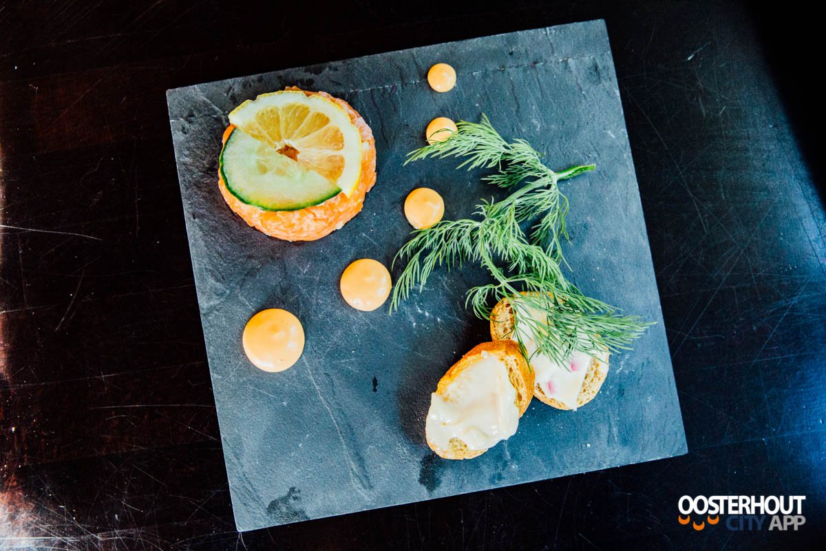 De klassieke zalmtartaar is zoals we hem graag hebben, bereid met de beste zalm, zacht en smeuïg. De knapperige toastjes, huisgemaakte frisse romige remouladesaus, verse citroen en dille maken dit gerechtje helemaal af. Een mooi begin van een mooie avond. We laten ons hierbij een Sauvignon de Turaine inschenken.