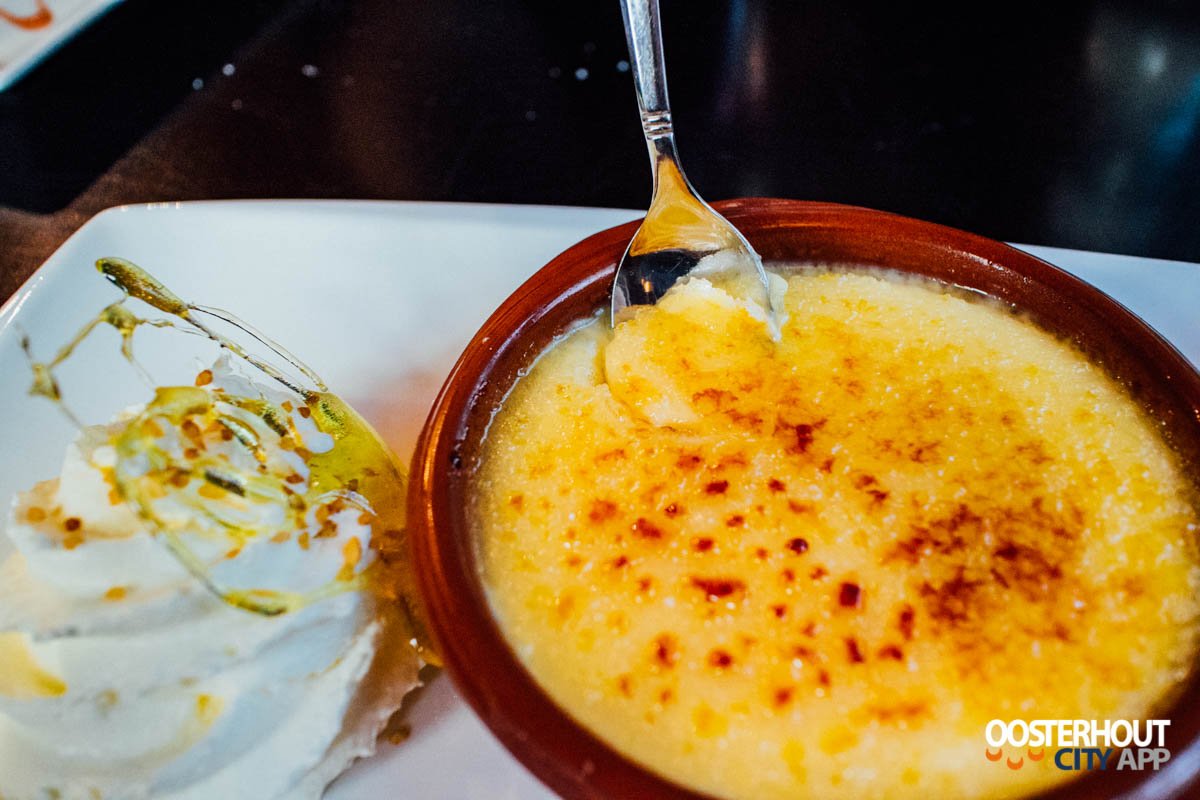Het is lastig kiezen uit de gerechtjes op de dessertkaart, zoveel lekkers! We beginnen met een Crème Brûlée met slagroom, op de klassieke manier bereid met een gebrand krokant suikerlaagje.
