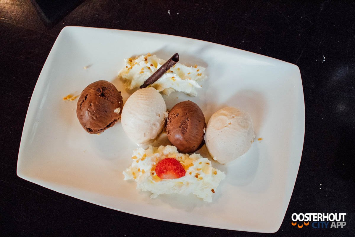 Het ijs van de chef is een wisselend ijsdessert. Wij krijgen ambachtelijk chocolade ijs en kaneel ijs met slagroom. Alles gaat weer op. Jummie!