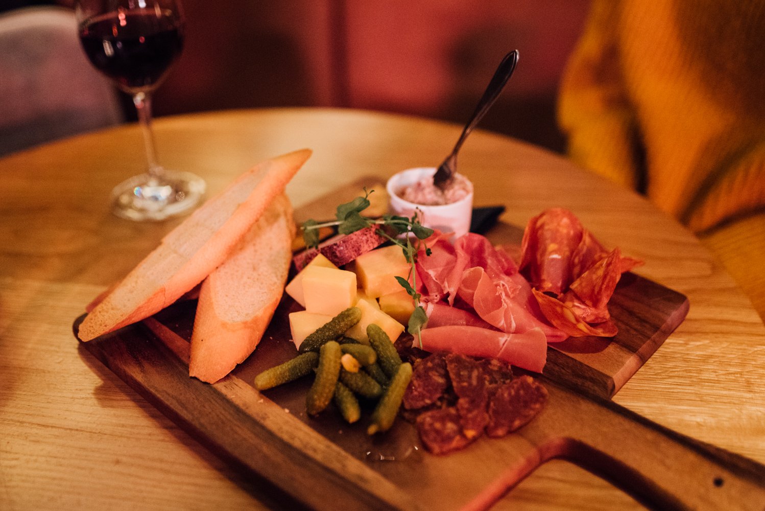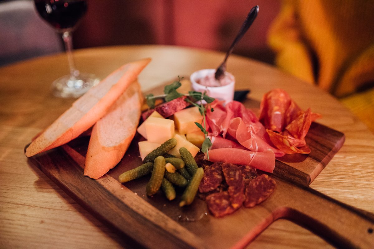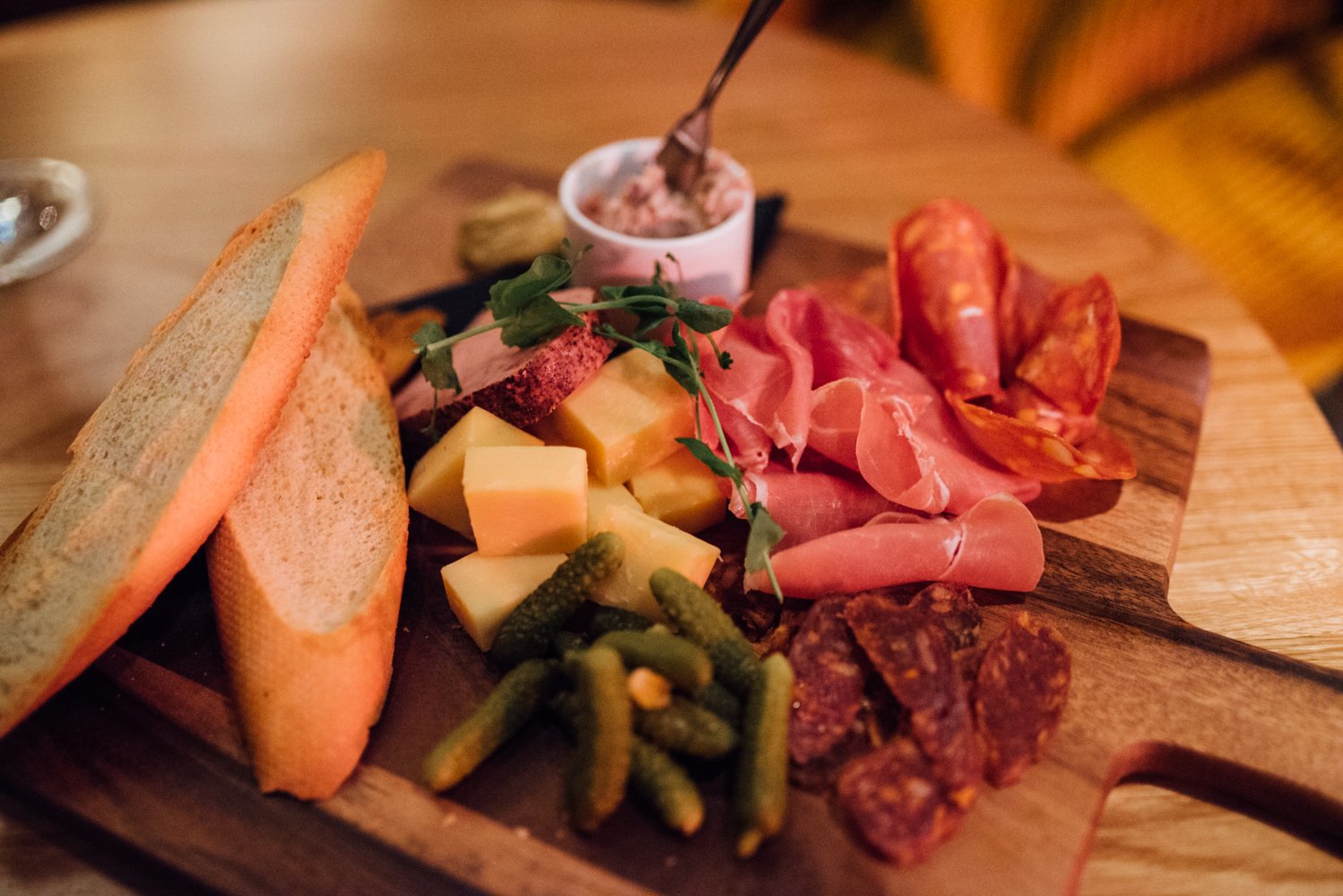 Plateau Noir is een luxe borrelplank met Serrano ham, Chorizo, gedroogde fuet, paté, oude kaas, augurkjes, rillettes en twee stukjes knoflooktoast. Leuk om te delen en een heerlijk begin van het diner.