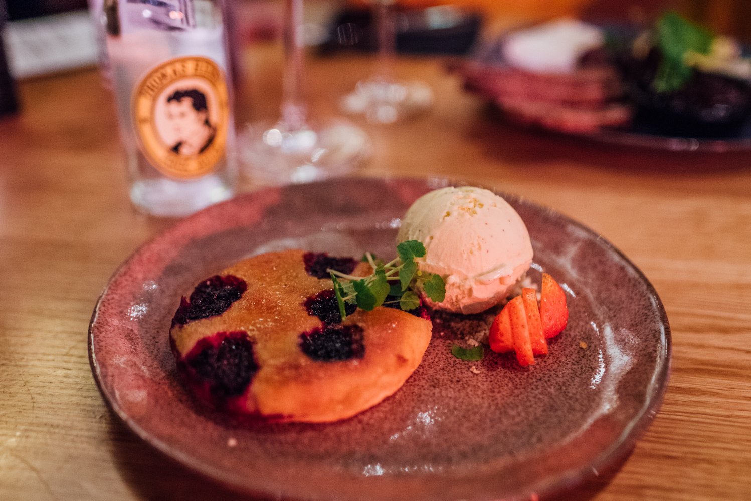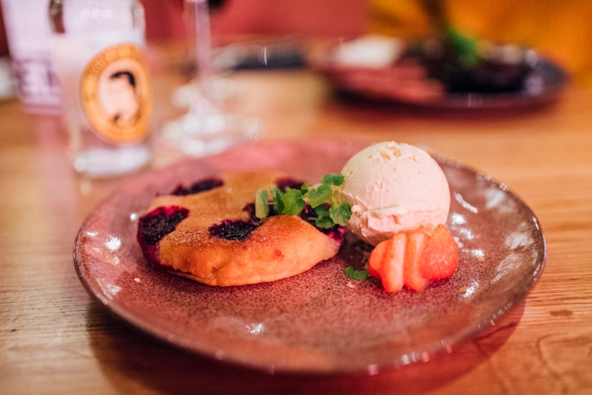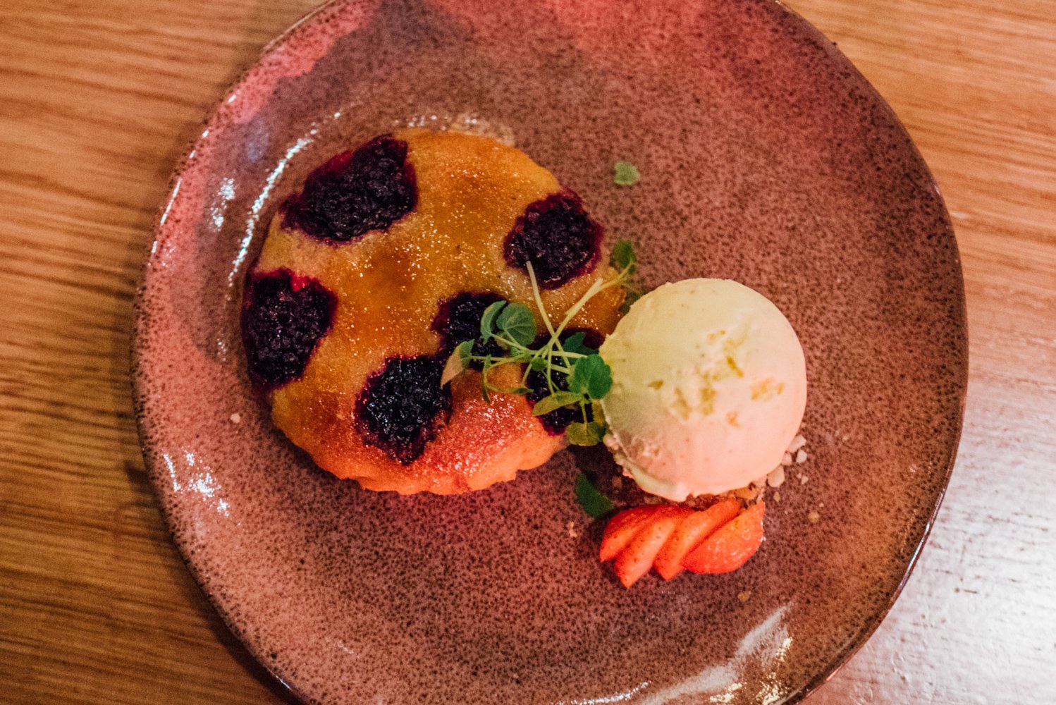 Tarte aux mûres is een luchtig bramentaartje met een bol vanille ijs. Een lekker zoete afsluiter van dit heerlijke diner.