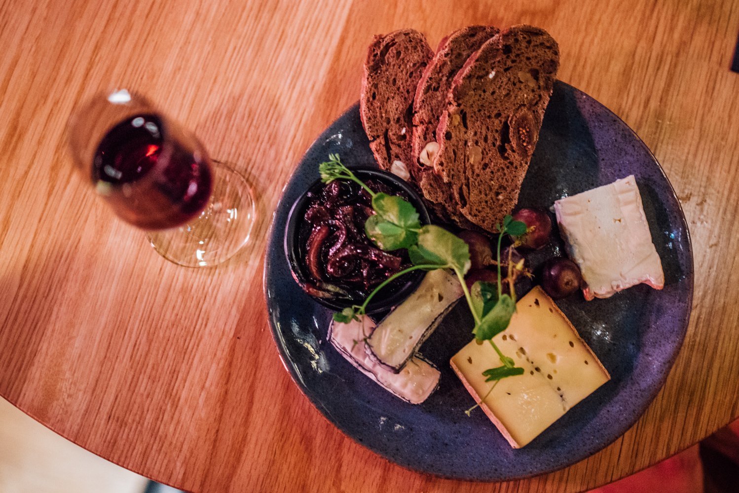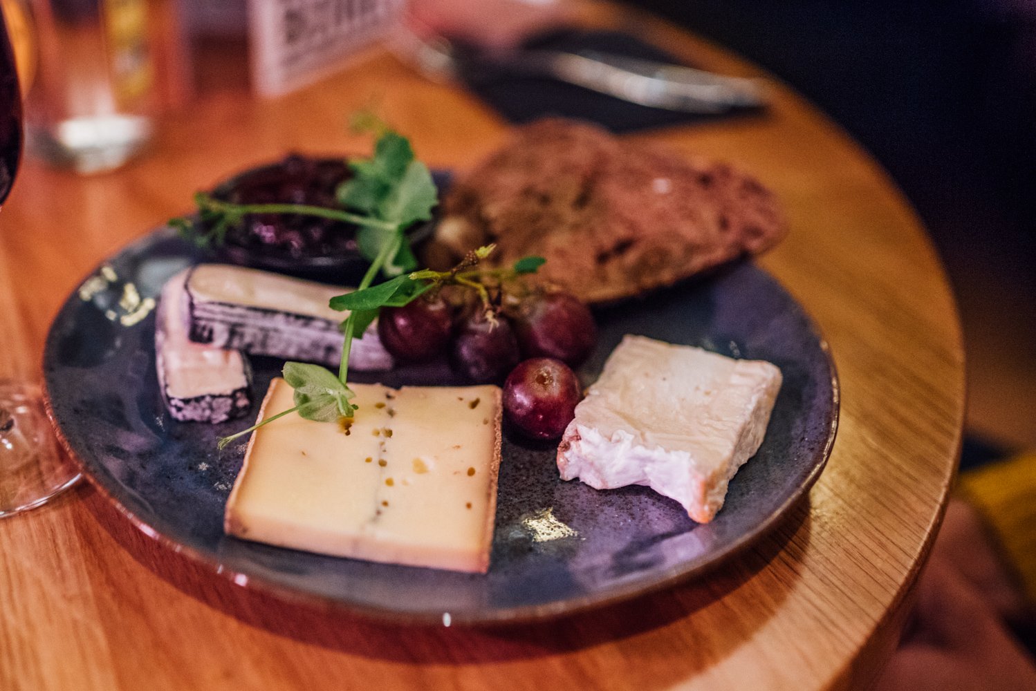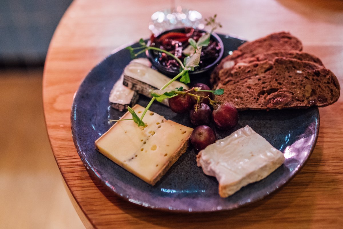 Voor het dessert kozen we voor de kaasplank met drie kazen en de tarte aux mûres. De kazen werden gecomplementeerd met uiencompote, marmalade en noten/vijgenbrood. We dronken hierbij een rode port die goed smaakte bij alle kazen.