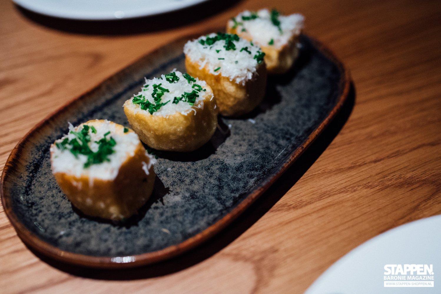 Het volgende gerechtje wat we geserveerd krijgen zijn de 'Patatas Bravas amb all i', dit zijn gekruide aardappelen met aïoli en een pittige saus op basis van tomaten. De aardappelen hebben een krokante bite en zijn een slag groter dan de patatas bravas die je meestal geserveerd krijgt in restaurants. De aïoli is heerlijk op smaak, en de tomatensaus is precies pittig genoeg. Ook als je niet goed tegen pittig eten kunt, is dit gerechtje heerlijk! De aardappelen zijn bestrooid met kaas en bieslook.