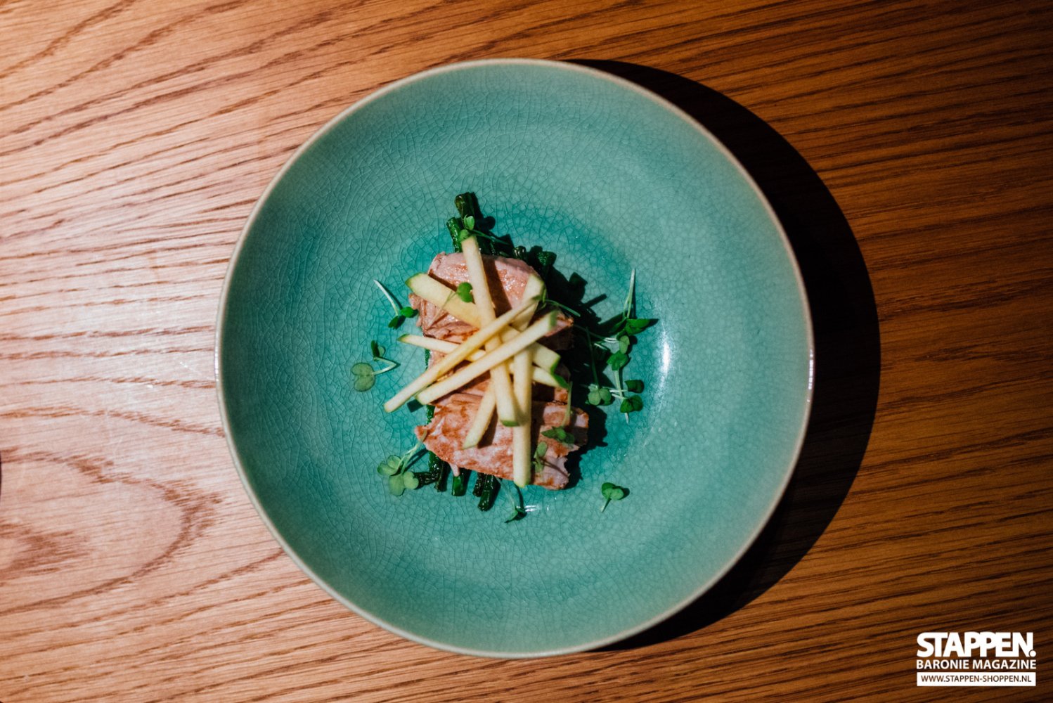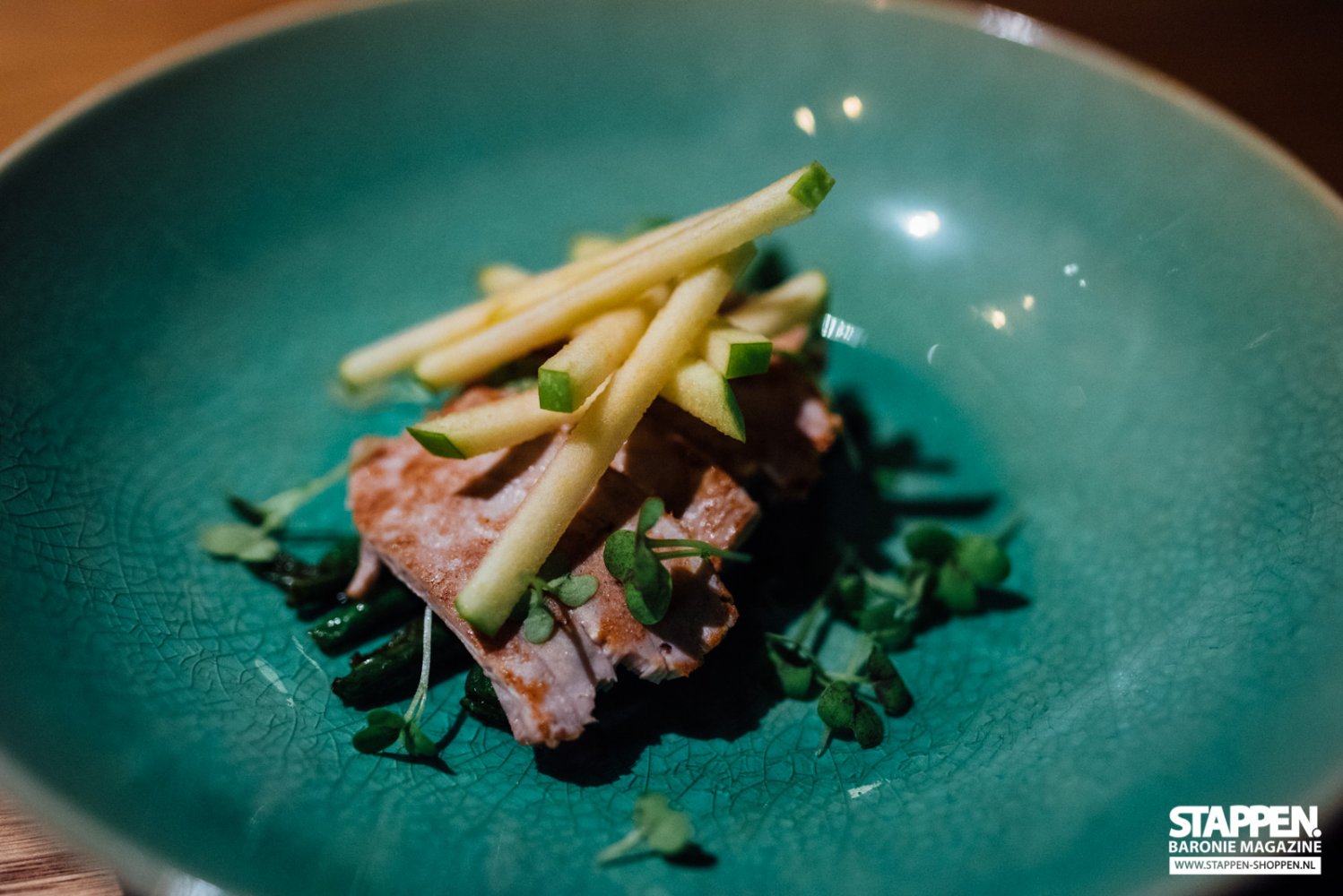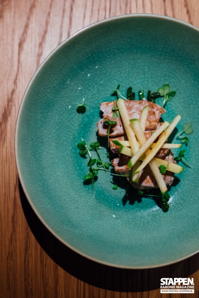 We vervolgens onze Catalaanse weg waar we de 'llom de tonyina sobre poma i vegetales' geserveerd krijgen. Dit is gebakken tonijn met appel en haricots verts. De tonijn is gemarineerd in soyasaus en mooi rosé gebakken doordat deze slechts enkele seconden gegrild is. De friszure, julienne gesneden appel zorgt voor een mooie frisheid in dit gerechtje.