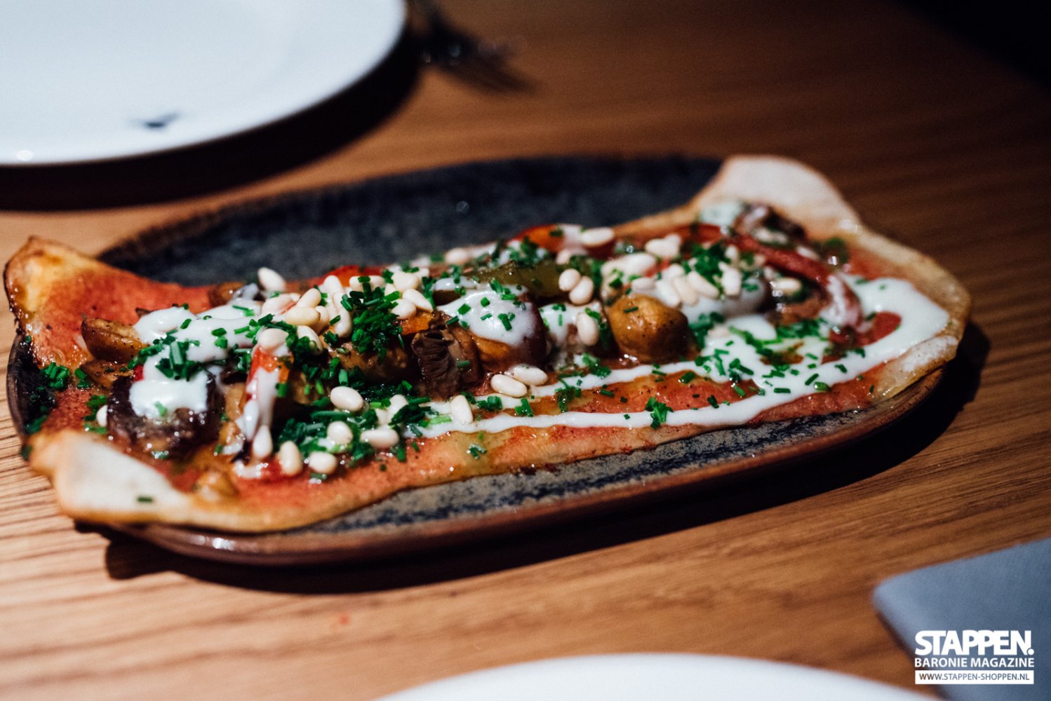 Na dit heerlijke vleesgerecht zijn we benieuwd geworden naar de 'Coca de bolet, pebrot i llimogreta de pinyons'. Dit is gemaakt met paddenstoelen, paprika, pijnboompitten en limoensaus. Het geheel ziet eruit als een soort pizza of flammküchen, maar dan anders. Het deeg is gemaakt van bladerdeeg en heerlijk knapperig. De paddestoelen en paprika zijn wederom perfect op smaak en zijn bestrooid met pijnboompitten en een kruidige limoensaus.