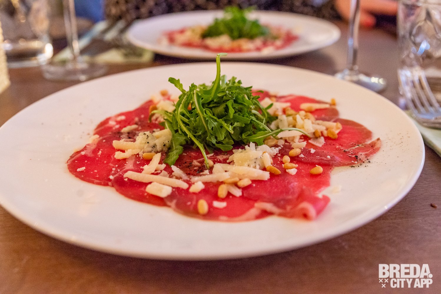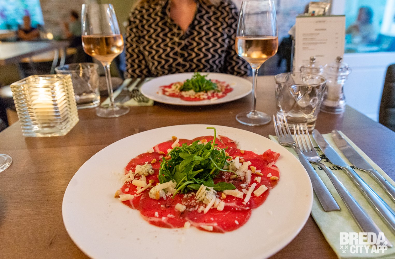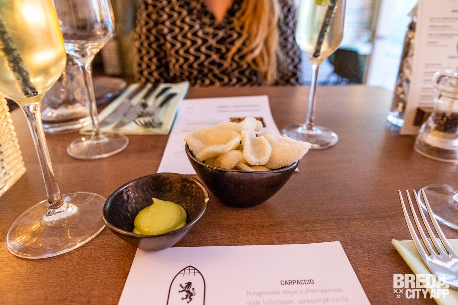 We beginnen het 5-gangen menu met een smaakvolle klassieke carpaccio: huisgerookte ribeye met truffelmayonaise, oude Turfschipper, pijnboompit en rucola.