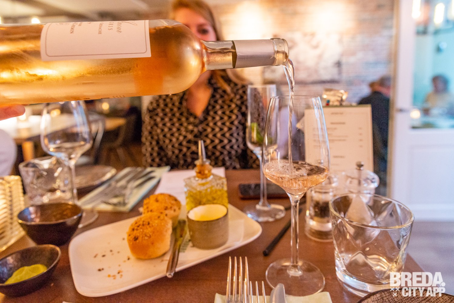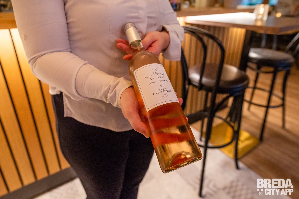 Dit lichte voorgerecht wordt gecombineerd met een lichte en fruitige Franse Rosé wijn: Domaine du Grand Chemin, Amour de Gris Rosé. Een wijn met smaken die doen denken aan meloen, rode appel en perzik. Overigens neemt de gastvrouw bij elke gang de tijd om -niet alleen de gerechten- maar ook de wijn te presenteren en de oorsprong en smaken hiervan toe te lichten.