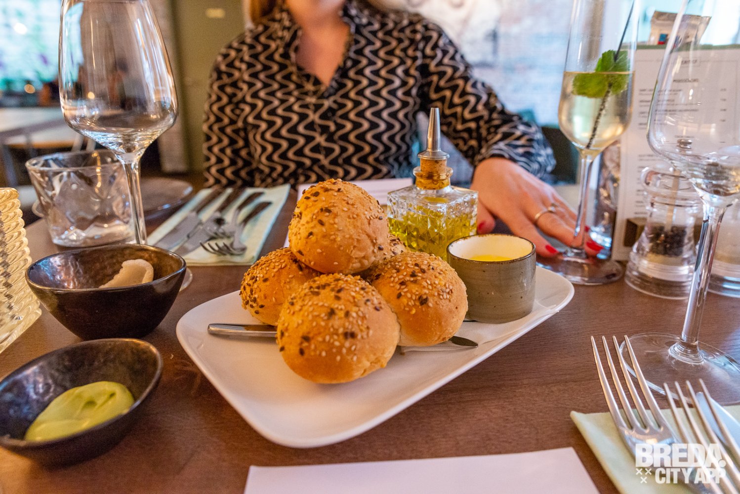 Daarbij krijgen we zelfgemaakte kroepoek met wasabimayonaise en citroen-zeezout broodjes met gezouten roomboter, gerookt zeezout en olijfolie vooraf.