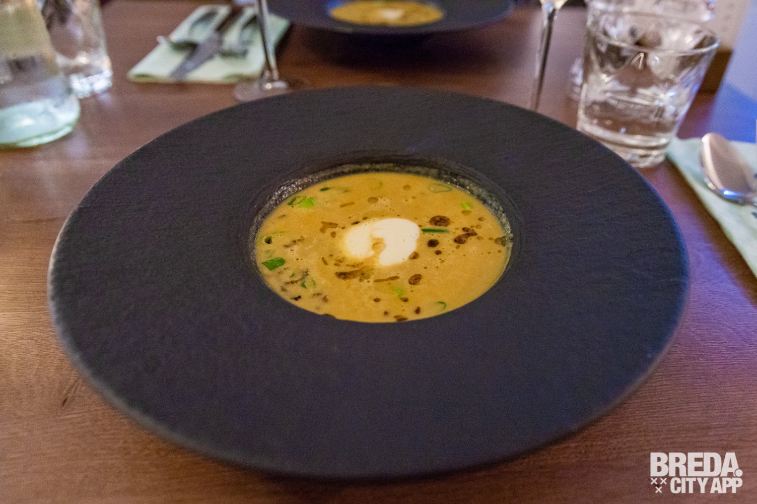 Er wordt een witte wijn ingeschonken en het tweede voorgerecht wordt gepresenteerd: een schuimige maissoep met crème fraîche en morilles (kruidige paddenstoelen) staat op het menu. We weten niet wat we van de maissoep kunnen verwachten, maar dit gerecht is wat ons betreft dé verassing van de avond! De soep heeft een volle, romige en unieke smaak door de mais als hoofdingrediënt, en de morilles geven een kruidige bite aan de soep; verassend smaakvol!