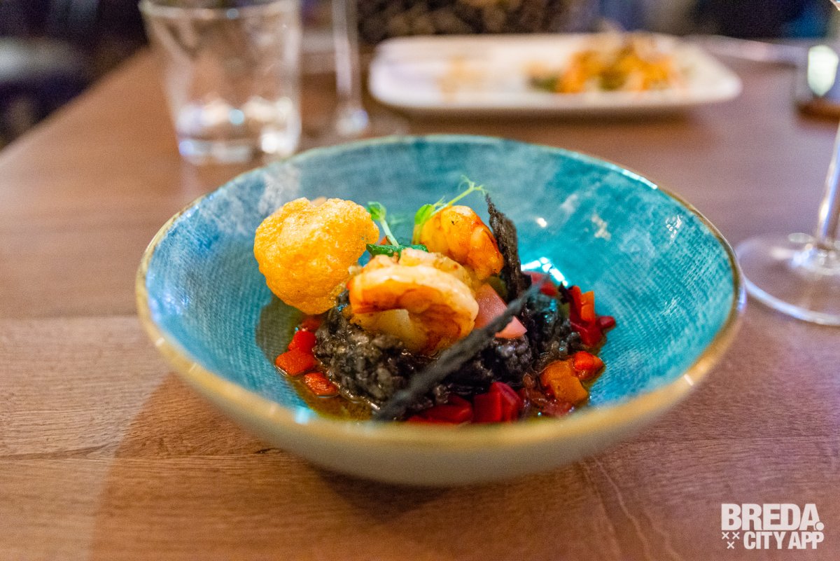 De volgende gang is het enige visgerecht van de avond: gamba's geserveerd op risotto nero, rode paprika, gamba olie en kroepoek. De kleurencombinatie van dit gerecht is verrassend en uitdagend: de gitzwarte risotto van inktvisinkt steekt mooi af tegen de felrode paprika. De smaak is niet anders: verassend, indringend en smaakvol.
