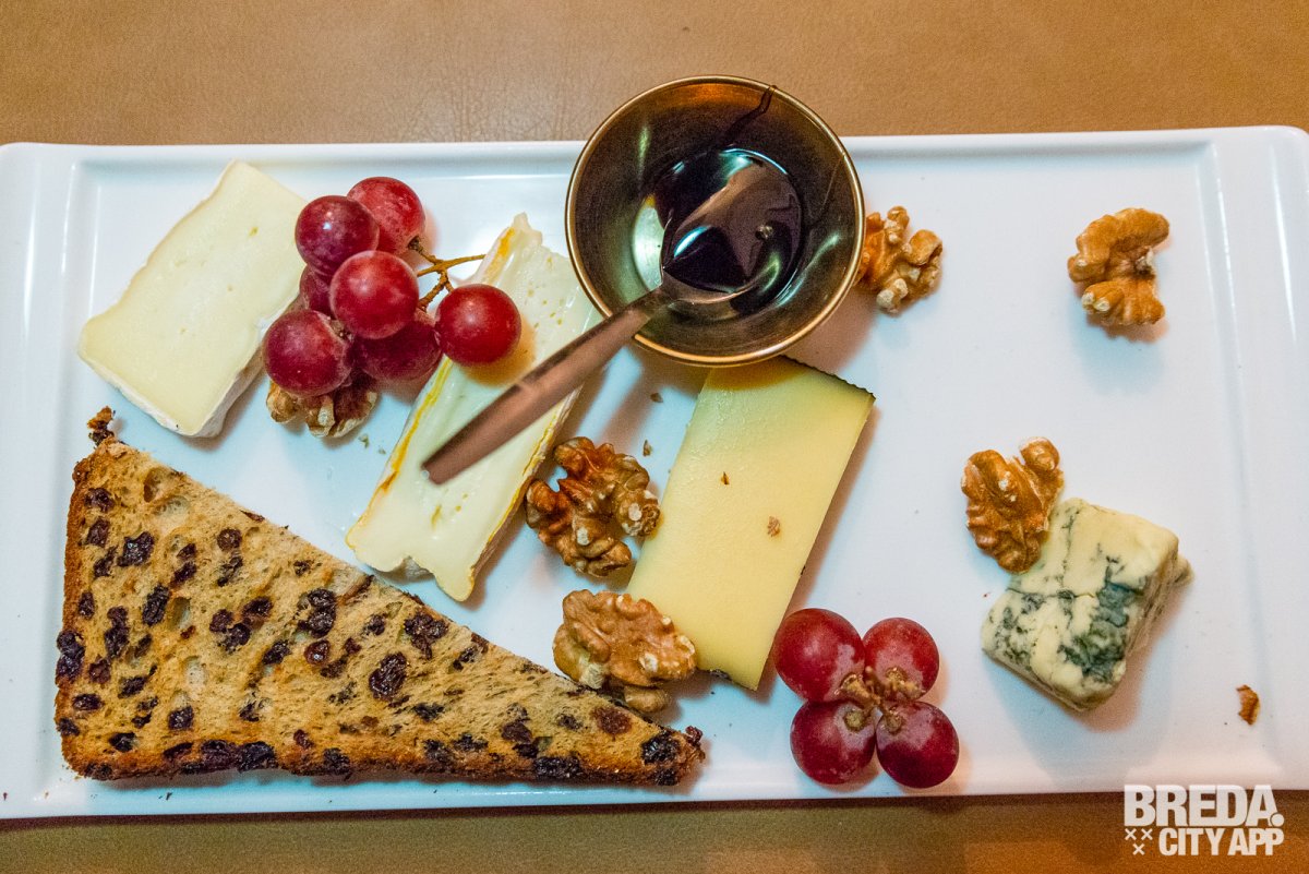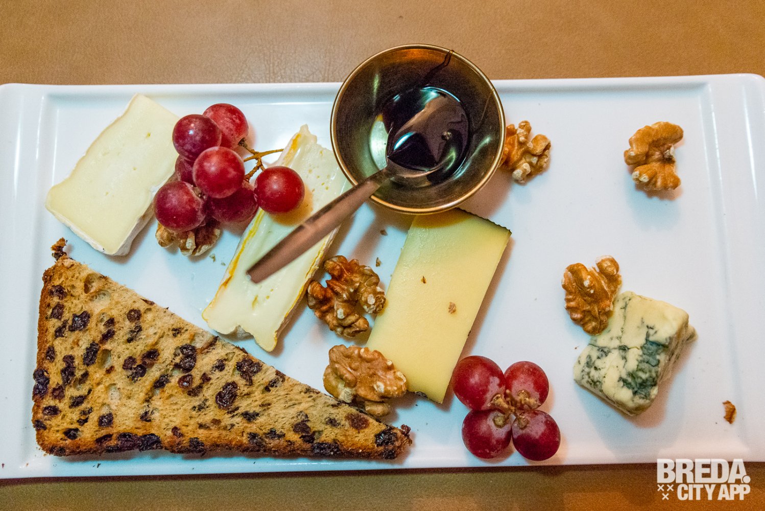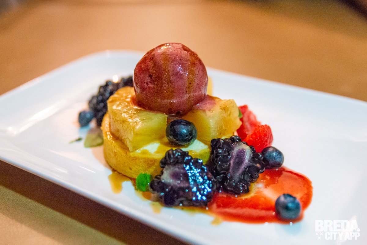 Voor het nagerecht krijgen we een zoet dessert en een kaasplankje. Het zoete dessert is een tartelette gevuld met banketbakkersroom met daarop gegrilde ananas en een bolletje bosvruchten sorbet. Het taartje zelf is kruimig, de smaak van de room is vol en zoet en de limoen brengt het gerecht in balans. Ook de warme gegrilde ananas combineert heerlijk met het ijskoude bolletje bosvruchten sorbet.