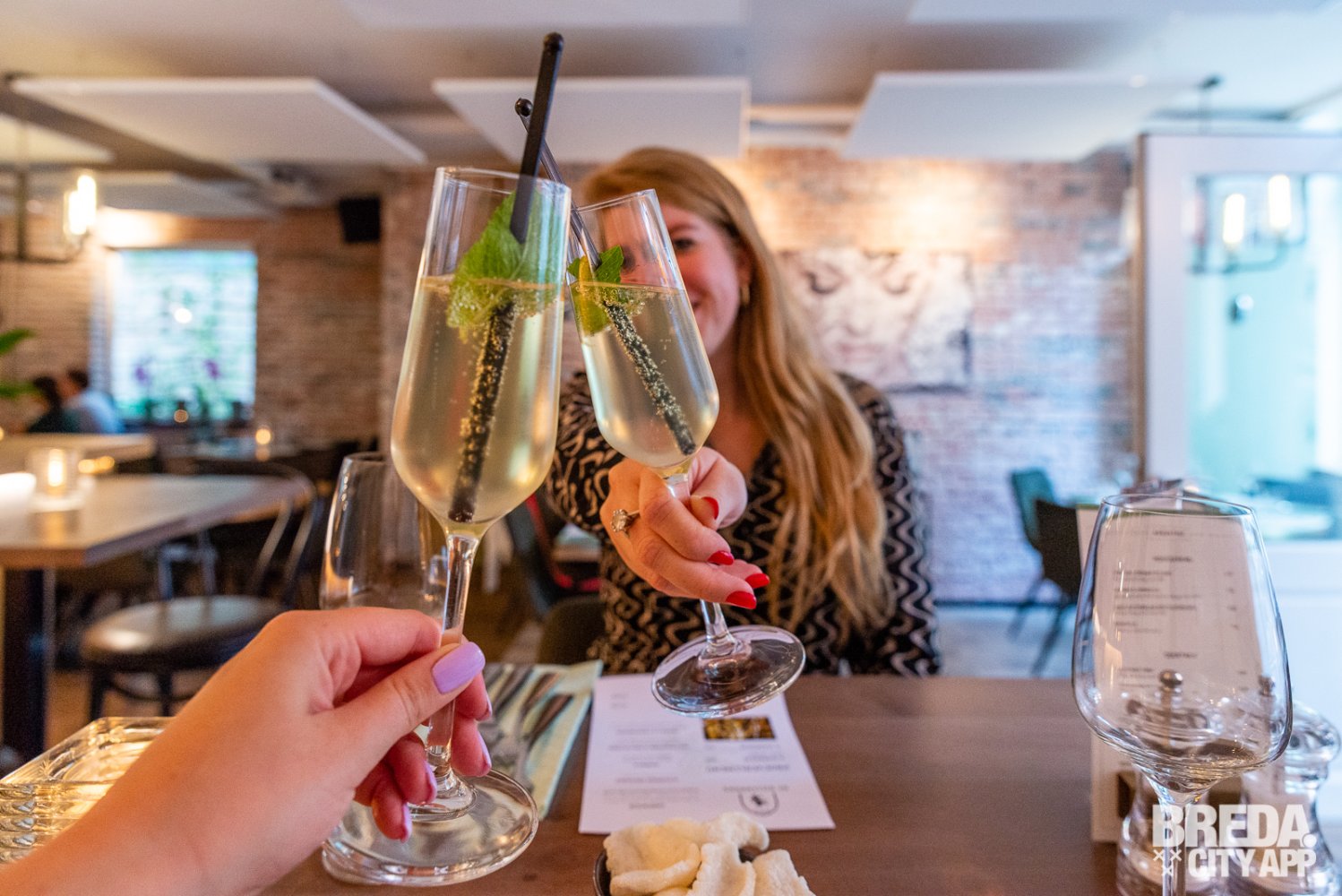 We kiezen voor het 5-gangen proeverij menu met een bijpassend (bob) wijnarrangement en trappen af met een fris aperatief: Crémant (een frisse mousserende wijn uit Frankrijk) met limoncello en een blaadje munt.
