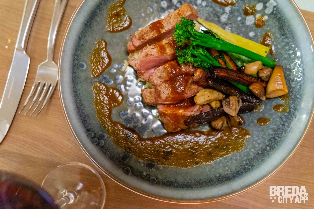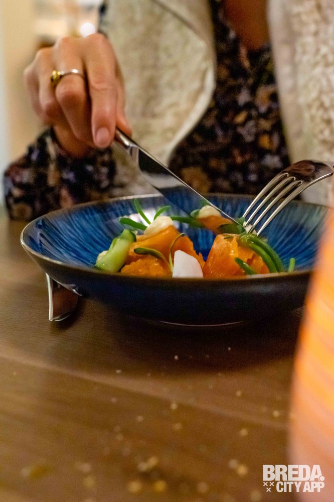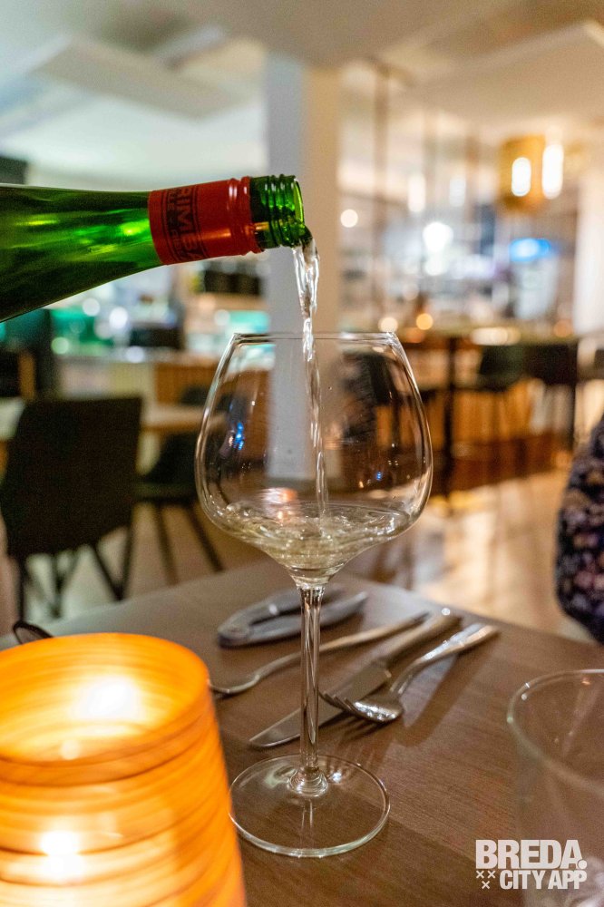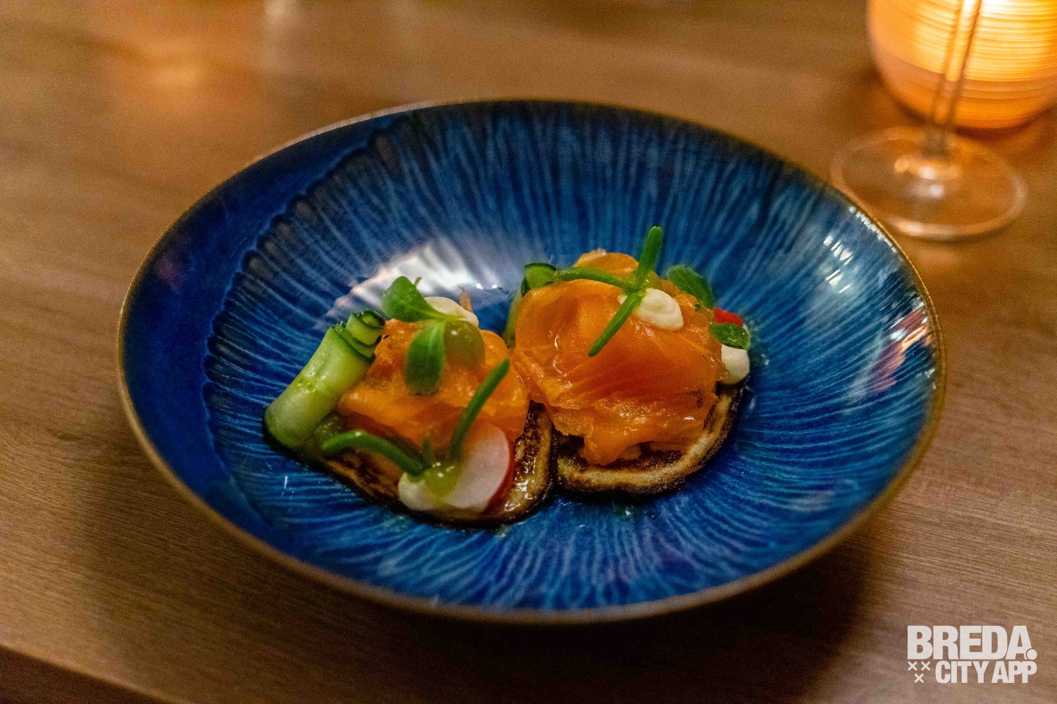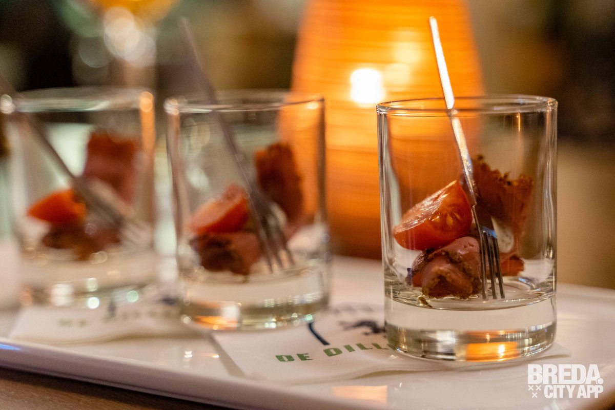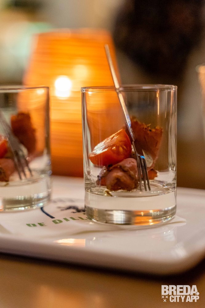 De Dillenburg in het Ginneken heeft gezellige zithoekjes en een open keuken. We kiezen een tafeltje in de hoek en zien een verrassende wijn op de kaart staan: Light Live Sparkling Rosé, alcoholvrij. Echt een aanrader en een mooi alternatief voor de bob onder het gezelschap! We krijgen een amuse van gerookte pastrami, cherrytomaat, truffelmayonaise en basilicum. Mals, romig en frisse smaken passen perfect bij de mousserende rosé.