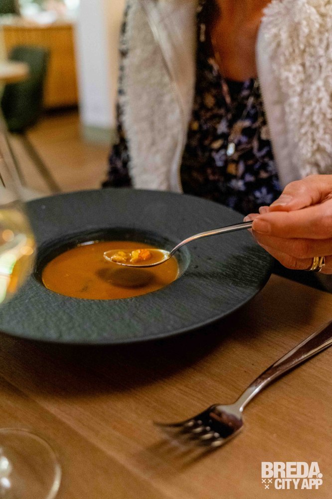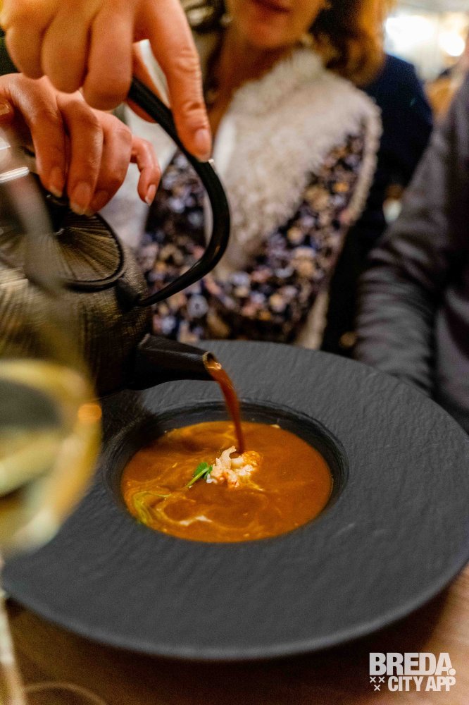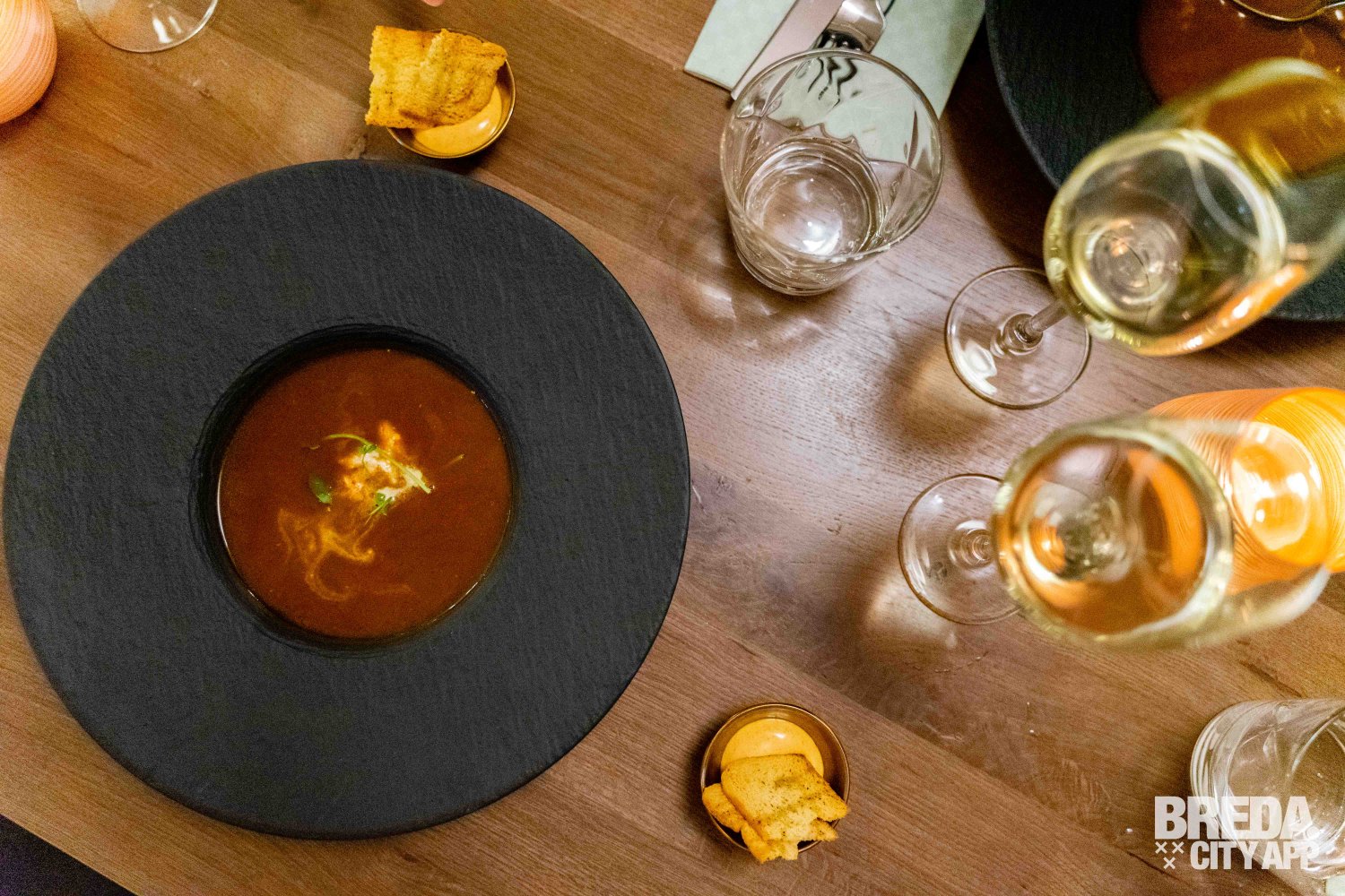 Het tussengerecht is een huisgemaakte schaaldierenbisque van Hollandse garnalen en rivierkreeft. De soep wordt aan tafel opgeschonken en hierbij krijgen we een kleine toast met rouille. Dit gerecht wordt bijgestaan door een fruitige Verdejo uit Rueda, Pago de Cielo, Spanje. Rueda is in de handen van de beroemde Spaanse wijnfamilie Torres en heeft de geur van venkel, anijs en munt. Het is een verrassende wijn die in smaak neigt naar ananas, citrus en mango. Met de bisque is het een perfecte combinatie en je merkt dat er goed is nagedacht over de verschillende smaaksensaties.