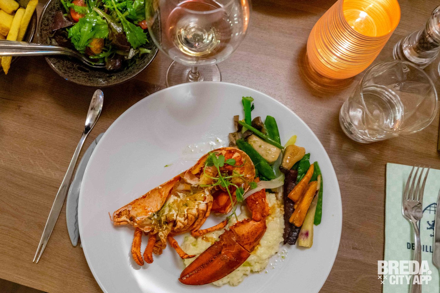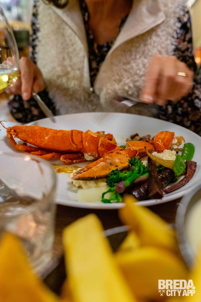 Het hoofdgerecht uit het Seafood Monday menu is een halve kreeft met geroosterde groenten. Mocht je niet van kreeft houden kun je altijd een ander gerecht kiezen van de kaart, we nemen hiernaast nog de malse wildzwijn.Zowel de kreeft als het vlees komt met verschillende side dishes: een frisse, romige risotto, krokante frietjes en een salade van sla, komkommer en tomaat. Bij de vis hoort een prachtige Pinot Blanc van Trimbach uit Elzas, Frankrijk. De wijn is toegankelijk, heeft een lage zuurgraad en smaakt naar gele appels, rijpe peren en heeft licht mineralige afdronk. Bij het vlees wordt een dieprode, intense en fruitige rode wijn geschonken met aroma's van zwarte bessen, rozemarijn en kruidnagel. Er is goed over nagedacht en de smaken versterken elkaar duidelijk.