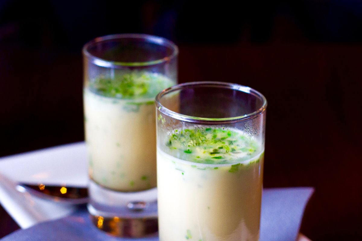 Bij het eerste drankje kregen we een heerlijke zacht van smaak, lichte vissoep, een amuse van het huis. Met de gember die nog even na smaakt was de vissoep een verrassing op zich.