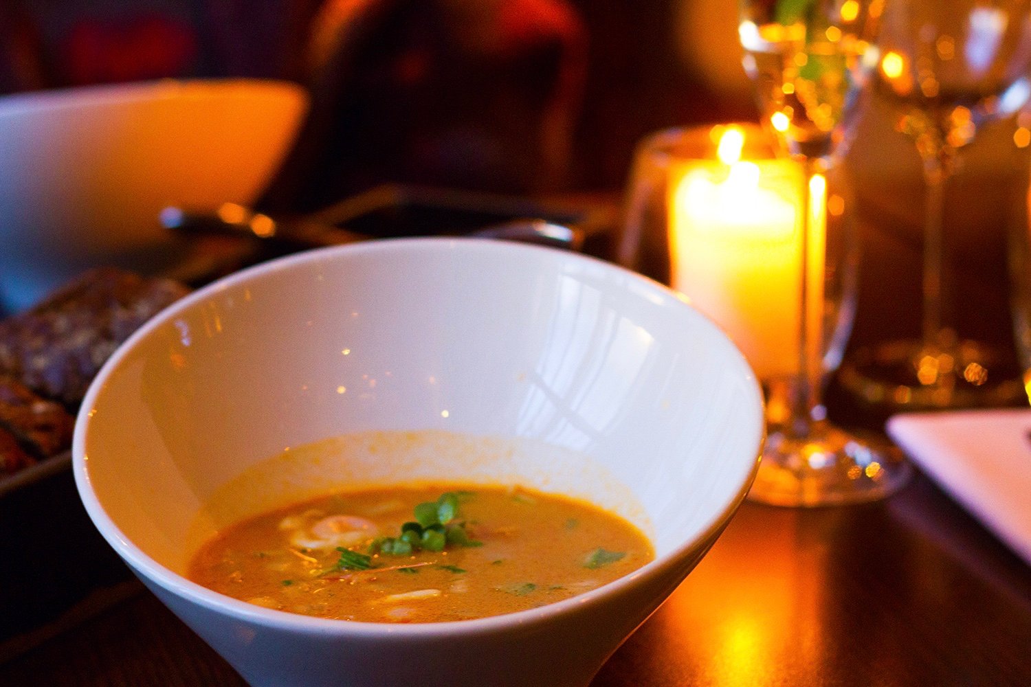 Daarna was het tijd voor onze voorgerechten. We zijn gegaan voor een 3 gangen menu, we konden ruim kiezen uit verschillende lekkernijen. Beide namen we de "Thom Kha Kai soep" met noedels, paksoi en gepocheerde kwarteleieren. Het bracht ons beide even terug aan onze vakantie in Azië. Een heerlijk licht-pittige soep.
