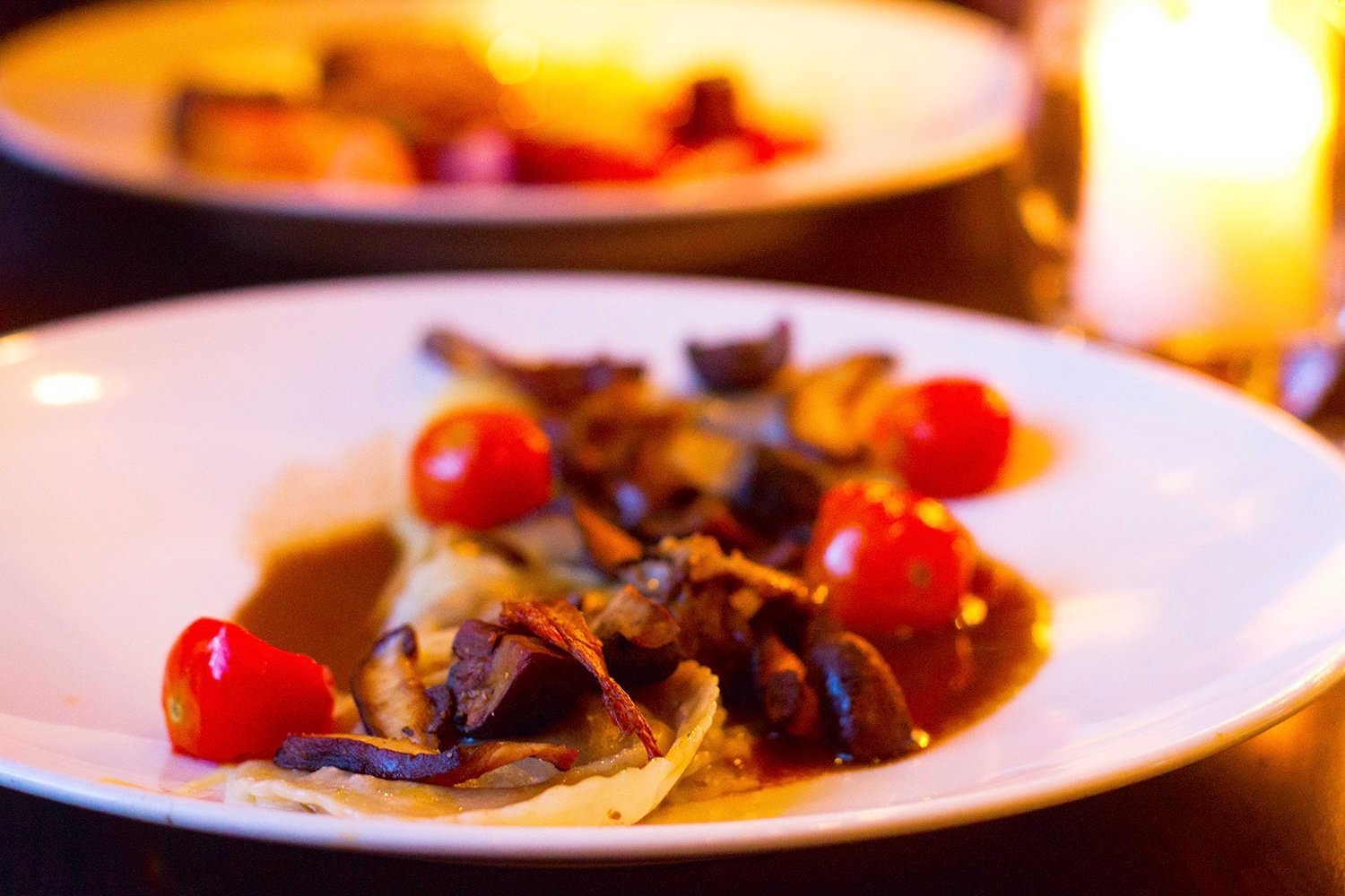 Het hoofdgerecht, zeker 10 dikke punten. Een paddenstoelen pasta met speciale Enokipaddenstoelen, paddenstoelen saus en frisse cherrytomaten. Verzot op paddenstoelen was dit gerecht een ware sensatie.