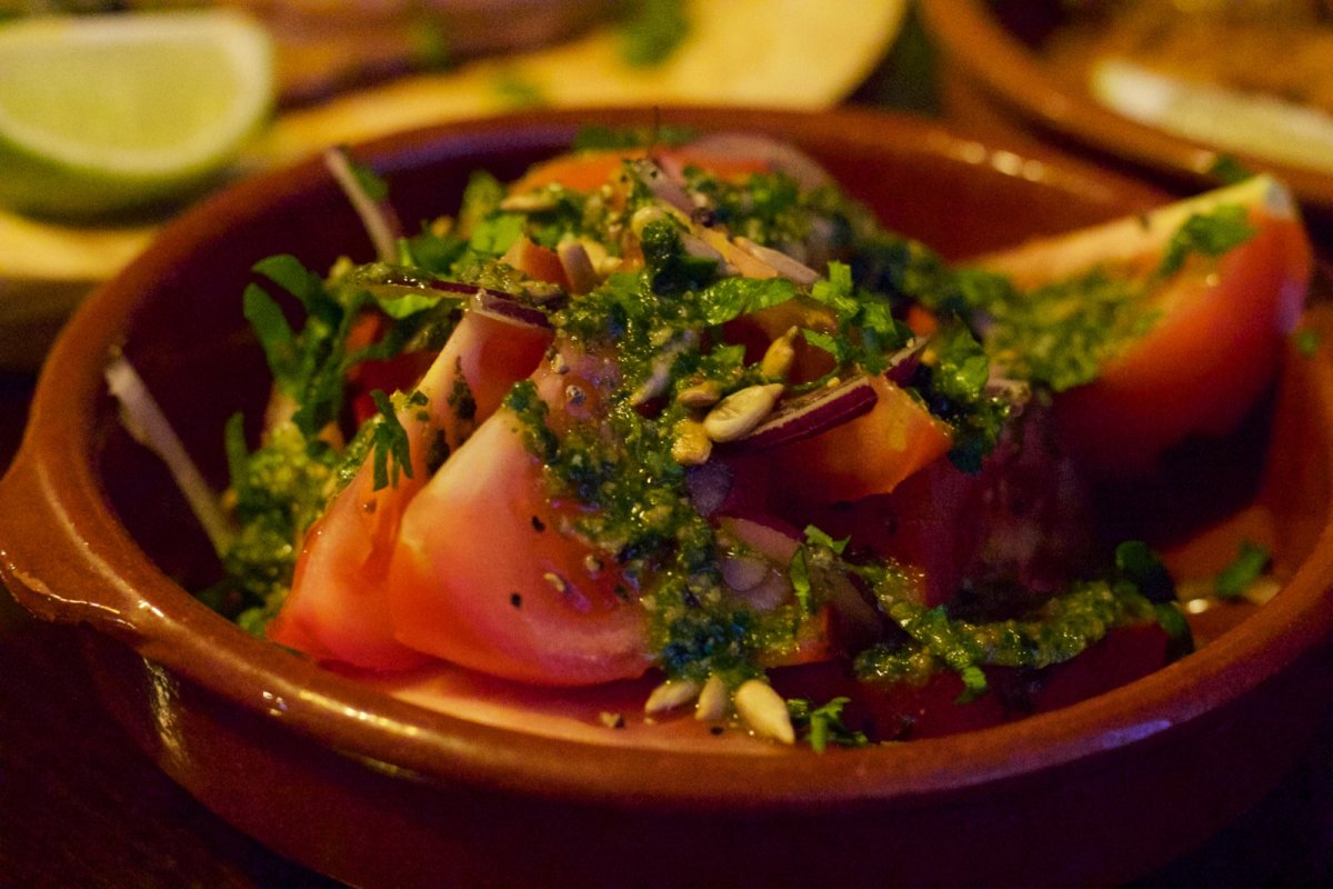Voor de vegetariër vanavond wordt een ‘ensalada de tomates con perejil’ geserveerd. Dit is een verse tomatensalade met rode ui en peterselie en heerlijk in zijn eenvoud.