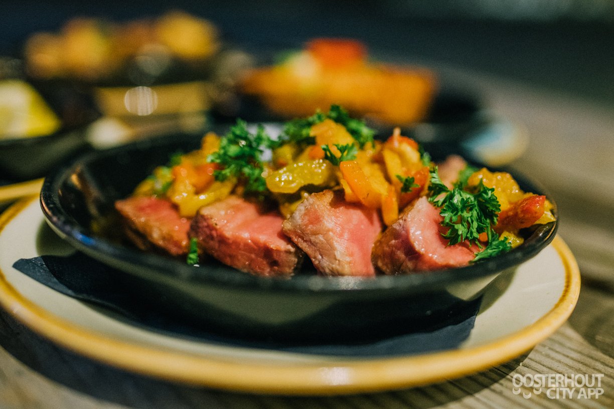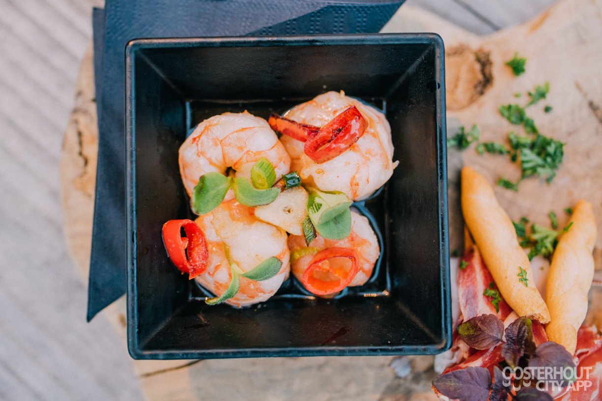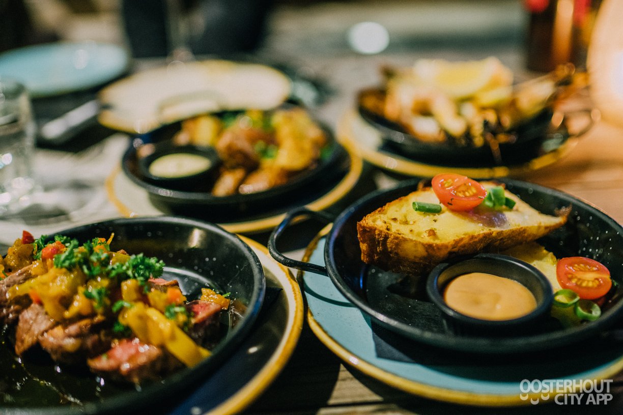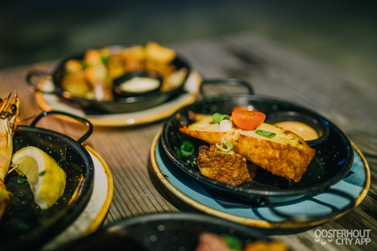 Dan mogen we twee dames zijn, maar we zijn niet vies van een avondje lekker eten. Na een perfecte break tussen de vier rondes in, zijn we klaar om de derde ronde te trotseren. Dit keer worden we verrast met klassiekers én nieuwe, warme gerechtjes. Twee tijgergamba's staren ons aan, de welbekende patatas aioli staan voor ons klaar, er ligt een tortilla de patata op de plank én malse, gemarineerde 'Salentein Premium Beef' entrecotes. Ondertussen wordt het donker en door de leuke terraslampjes ziet het er sfeervol uit buiten. Daarnaast hebben we helemaal niet het idee dat we midden in het centrum van Oosterhout zitten. Van de drukke Klappeijstraat merken we niets en door de decoratie worden we compleet ondergedompeld in de mediterraanse sferen.
