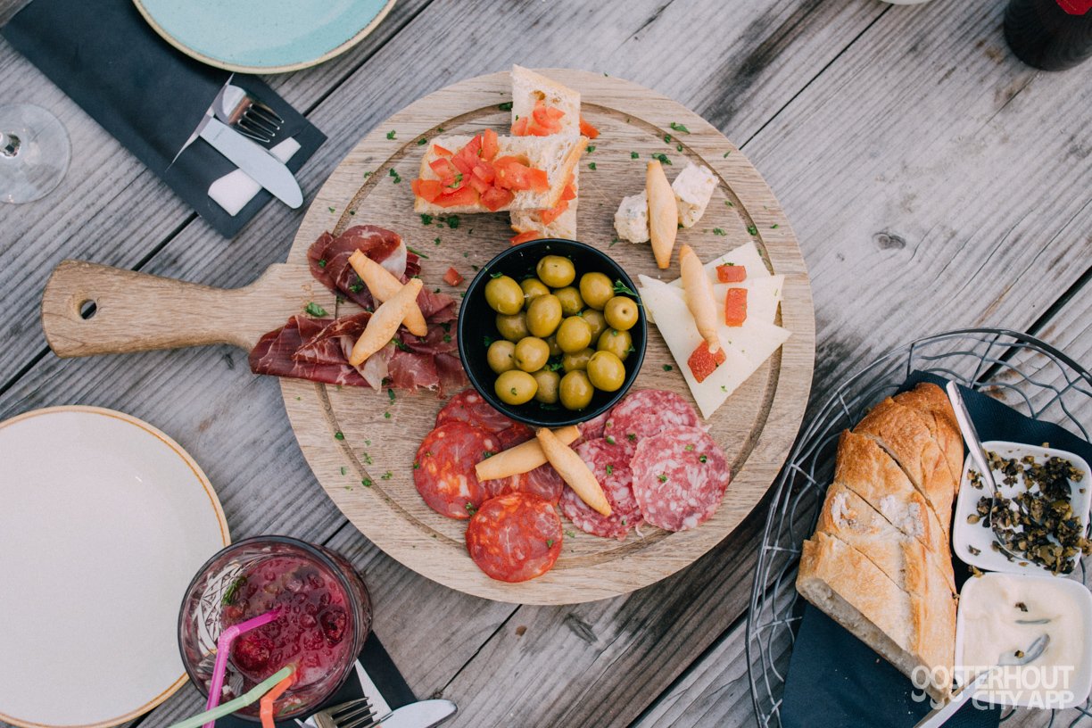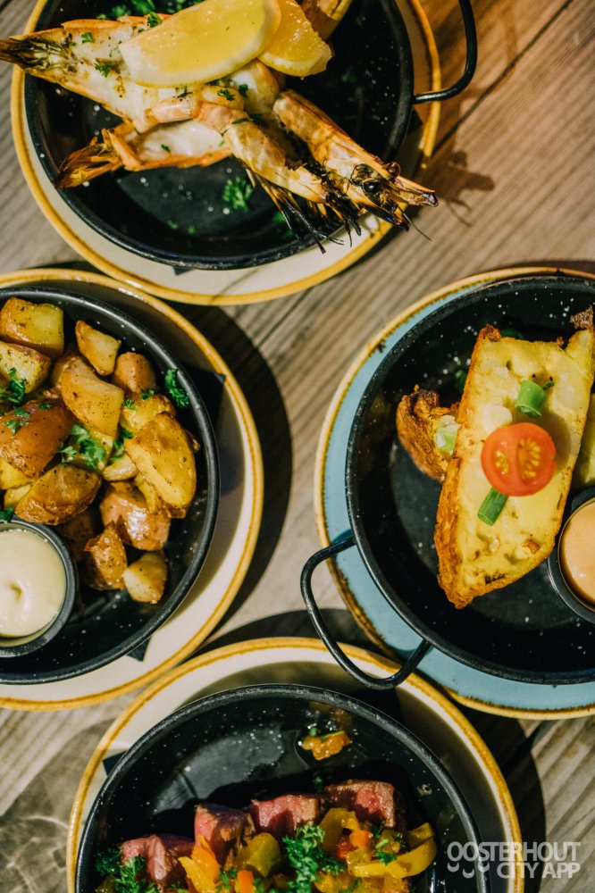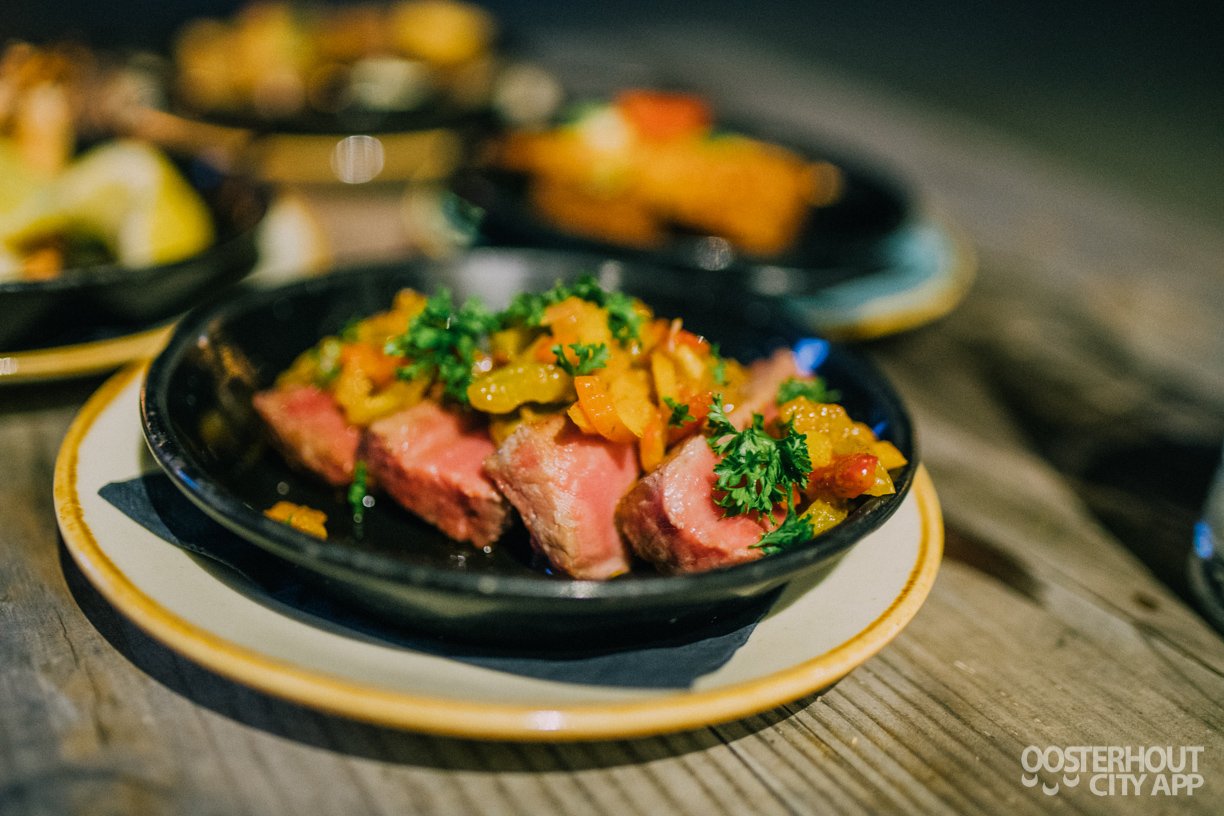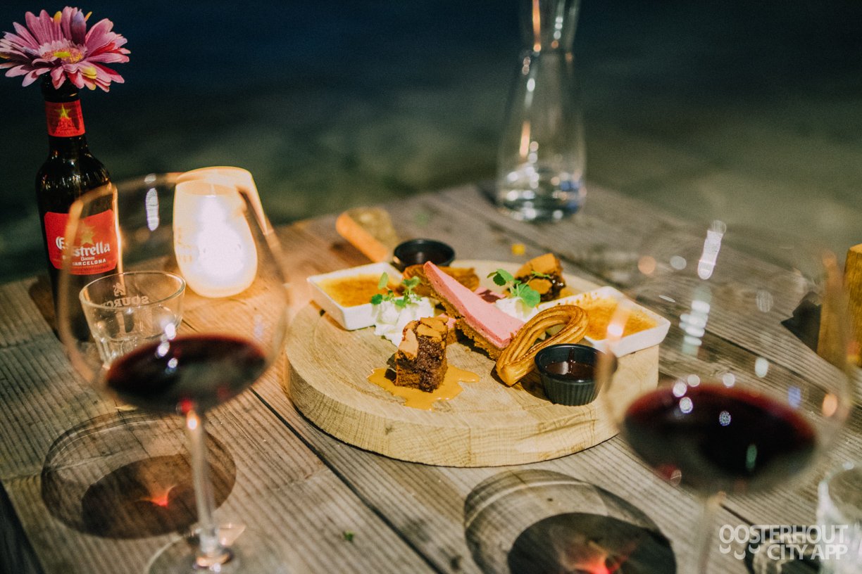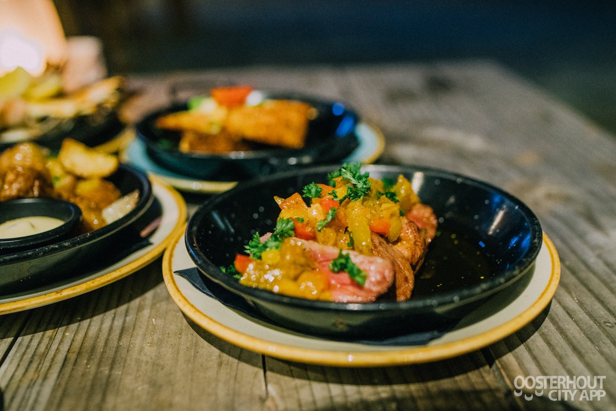 Dan mogen we twee dames zijn, maar we zijn niet vies van een avondje lekker eten. Na een perfecte break tussen de vier rondes in, zijn we klaar om de derde ronde te trotseren. Dit keer worden we verrast met klassiekers én nieuwe, warme gerechtjes. Twee tijgergamba's staren ons aan, de welbekende patatas aioli staan voor ons klaar, er ligt een tortilla de patata op de plank én malse, gemarineerde 'Salentein Premium Beef' entrecotes. Ondertussen wordt het donker en door de leuke terraslampjes ziet het er sfeervol uit buiten. Daarnaast hebben we helemaal niet het idee dat we midden in het centrum van Oosterhout zitten. Van de drukke Klappeijstraat merken we niets en door de decoratie worden we compleet ondergedompeld in de mediterraanse sferen.