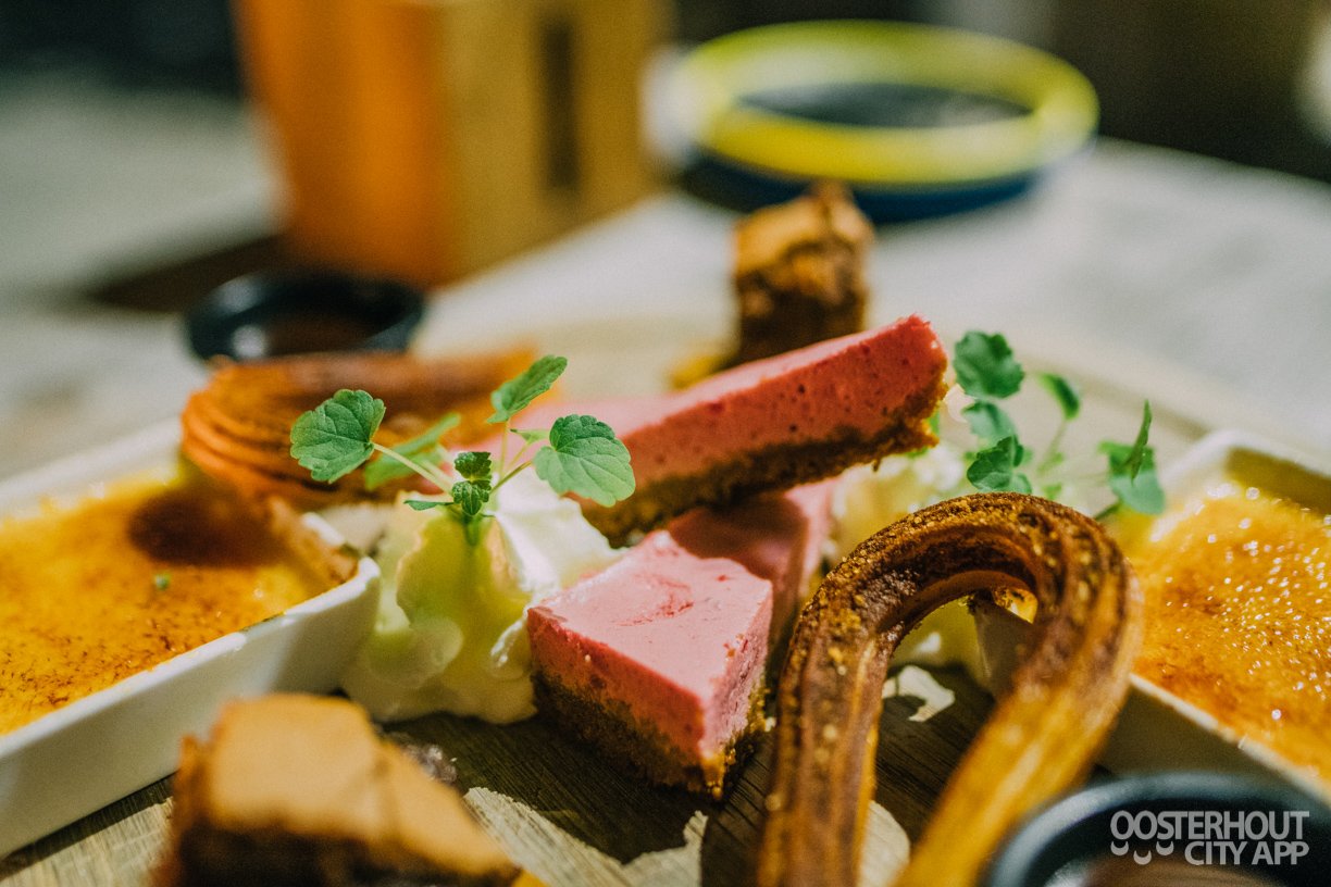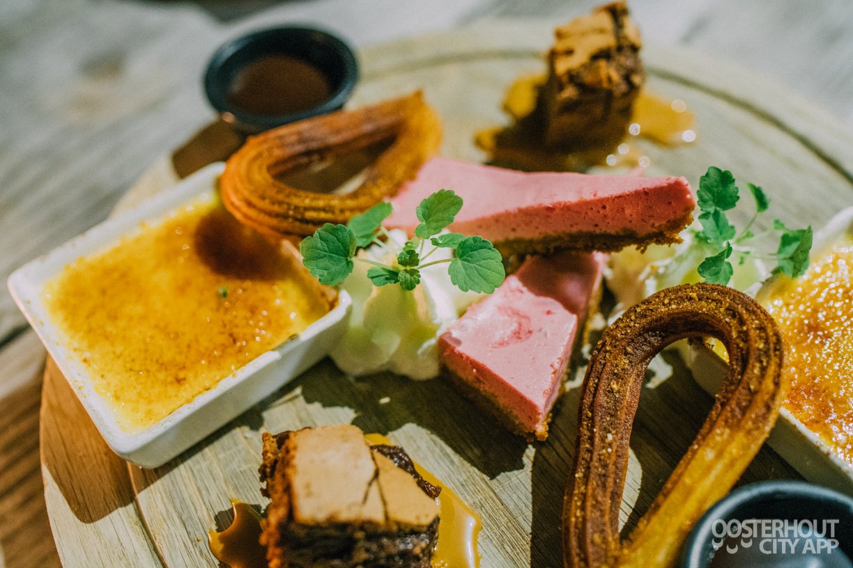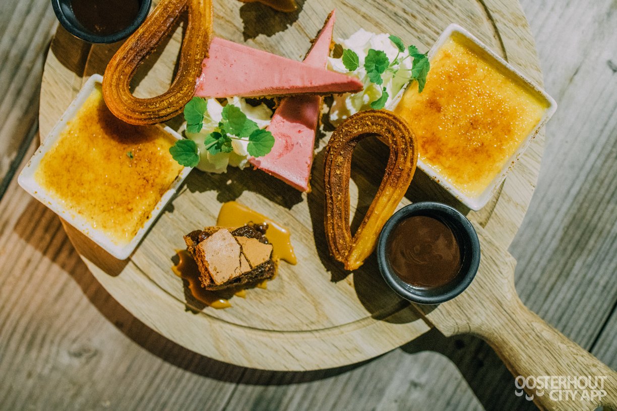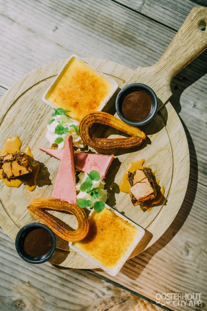 Last but not least: desserts! Het is zo fijn als je niet hoeft te kiezen, maar je gewoon van alles wat krijgt. Zeker een van de voordelen van het verrassingsmenu! We zijn er al snel over uit dat we voor een zoete dessertplank gaan. Wat houdt dit in? Twee heerlijke churros met chocoladesaus, crema catalana, brownies met butterscotch en frambozenbavarois op een bodem van bastogne koek. Nog steeds zitten we buiten en na een cappuchino en een verse thee besluiten we unaniem: "Ongedwongen genieten bij La Cantina" wordt zeker waar gemaakt!