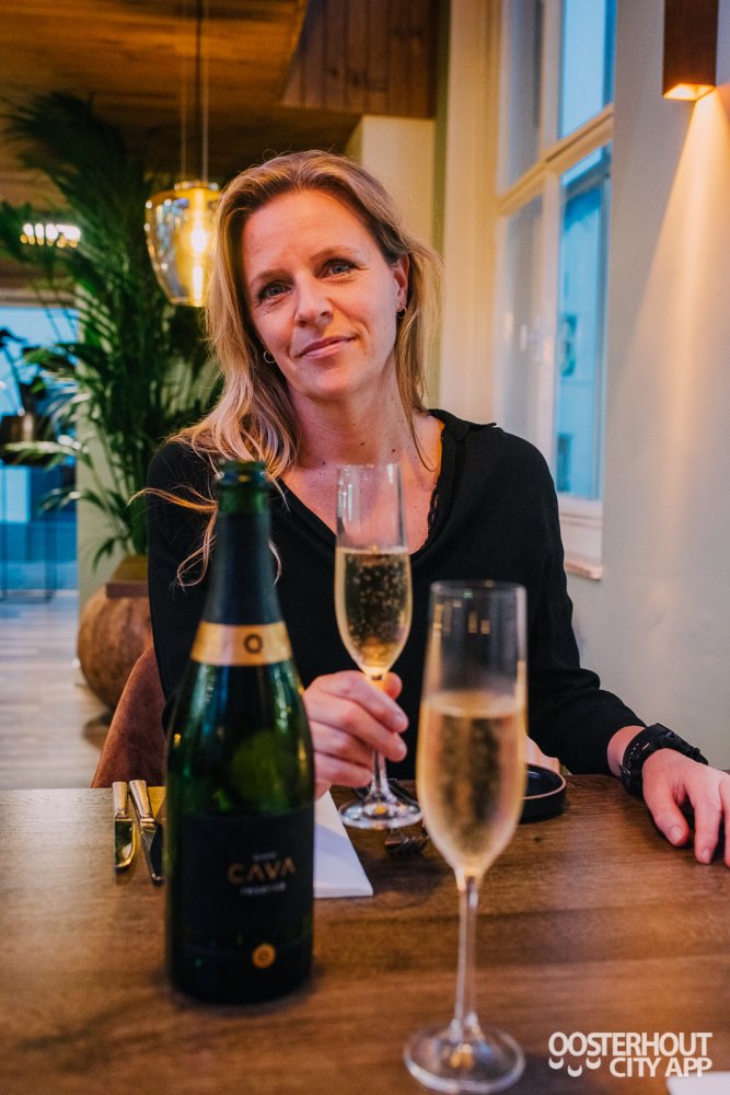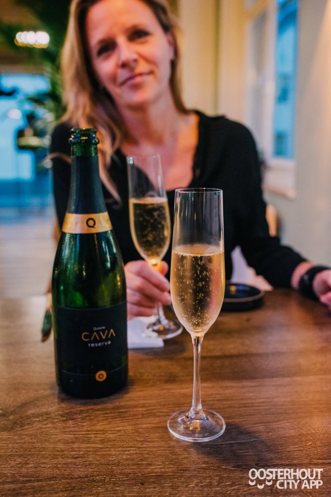 Er wordt ons een droge en zachte Spaanse Reserva Cava van het huis aangeboden die door de bediening op een geestige manier wordt geïntroduceerd.
