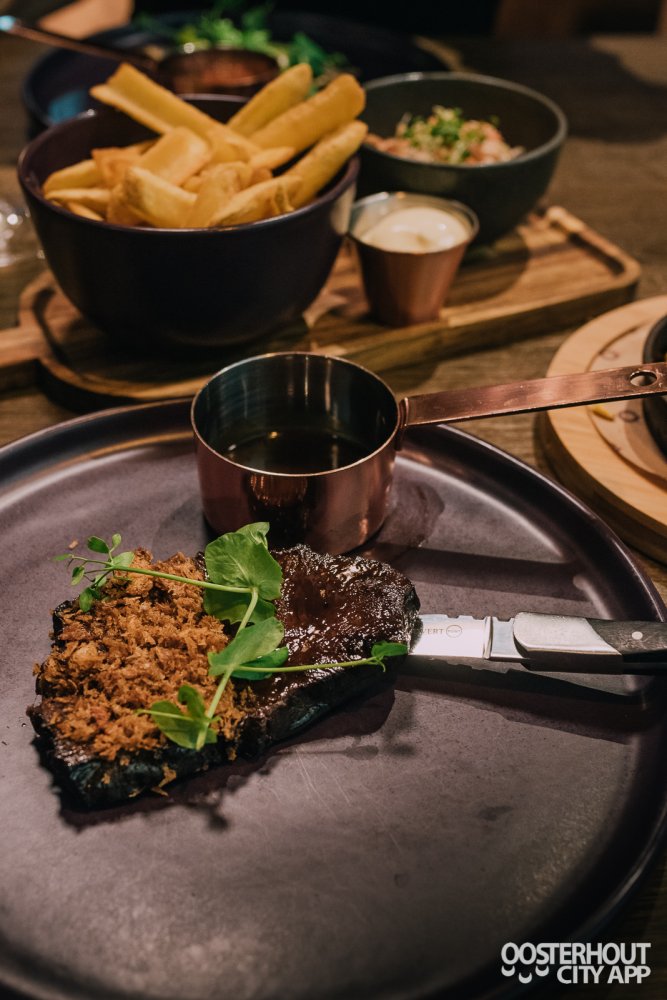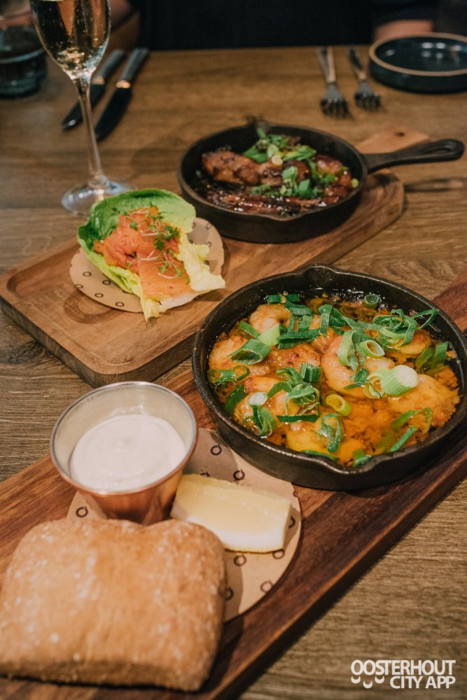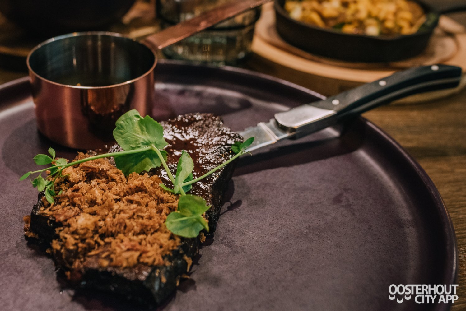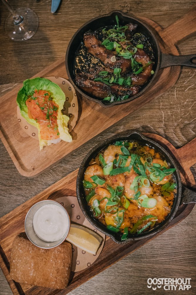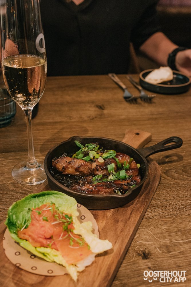 Aansluitend kiezen we voor een voorgerecht ‘Garnaal knoflook met rode peper, citroen en brood’. Een heerlijk glas Amanovo wit laat de smaken samensmelten. Ook het gerecht Boneless Ribs in Hoisinsuas met sesam, kimchi en tuinkers is zeer mals en precies goed gekruid. De kimchi geeft het een verrassende twist wat het gerecht nog lekkerder maakt. Wat ons opvalt is dat zowel in het voorgerecht alsook bij het hoofdgerecht steeds een leuke en creatieve smaak twist zit in de gerechten.