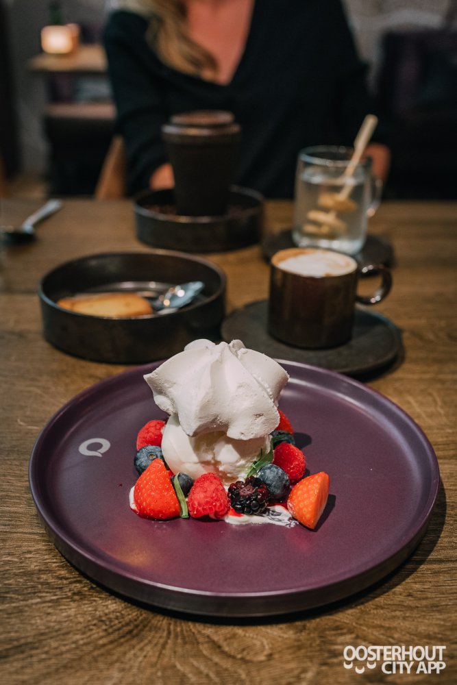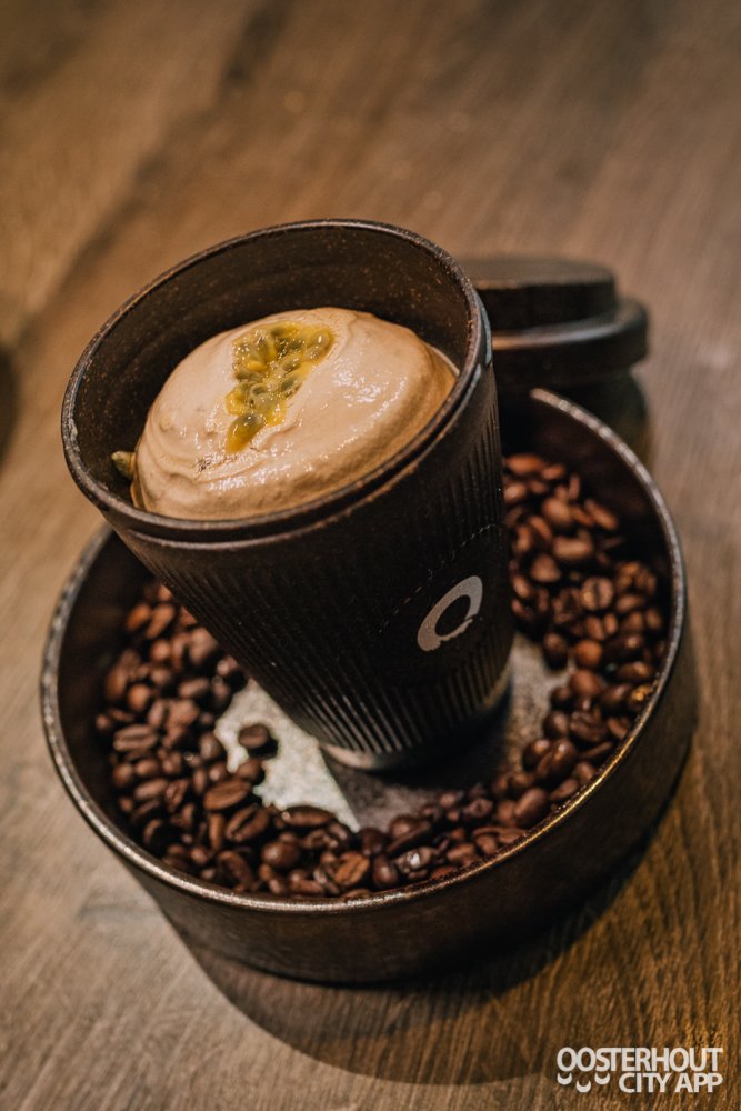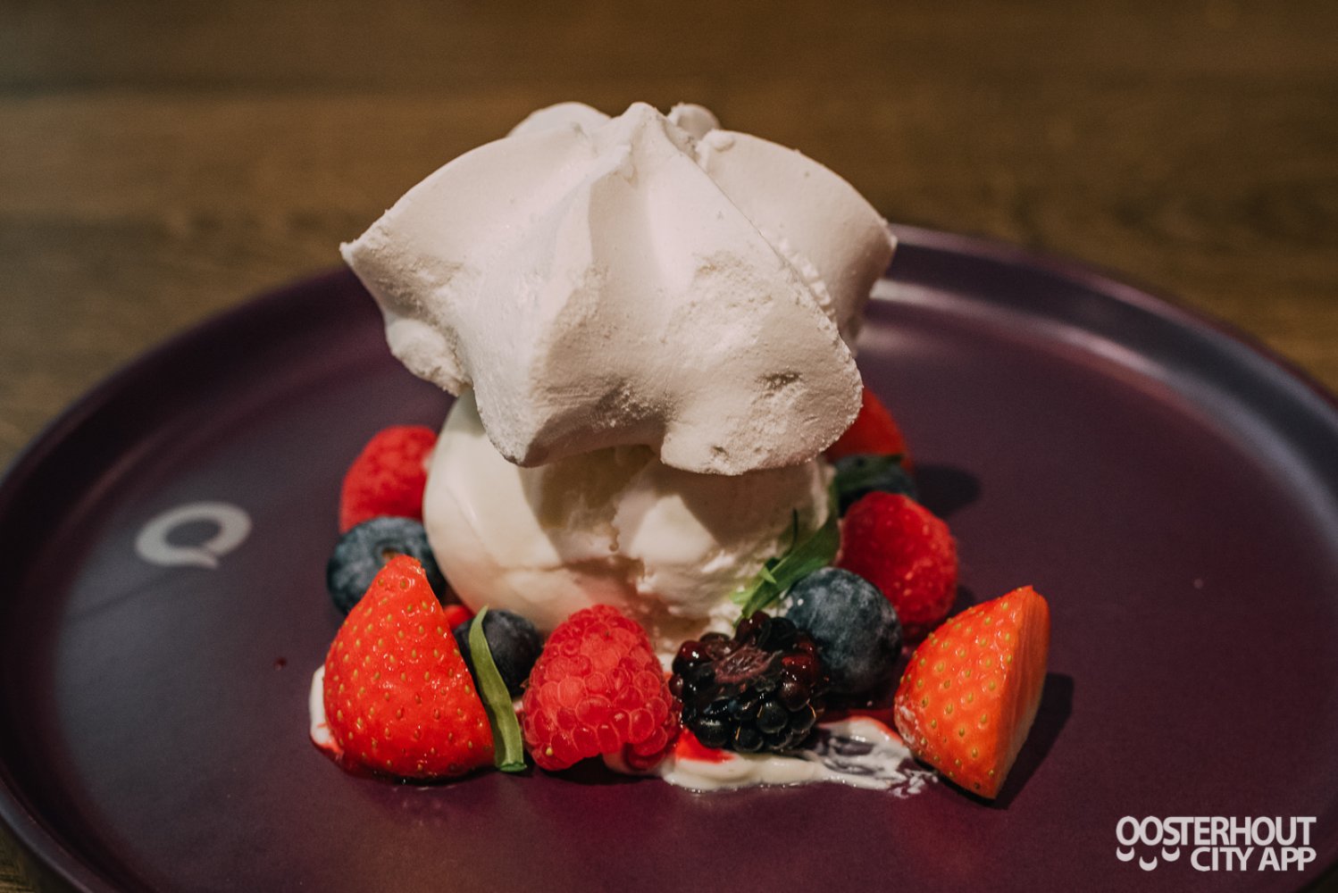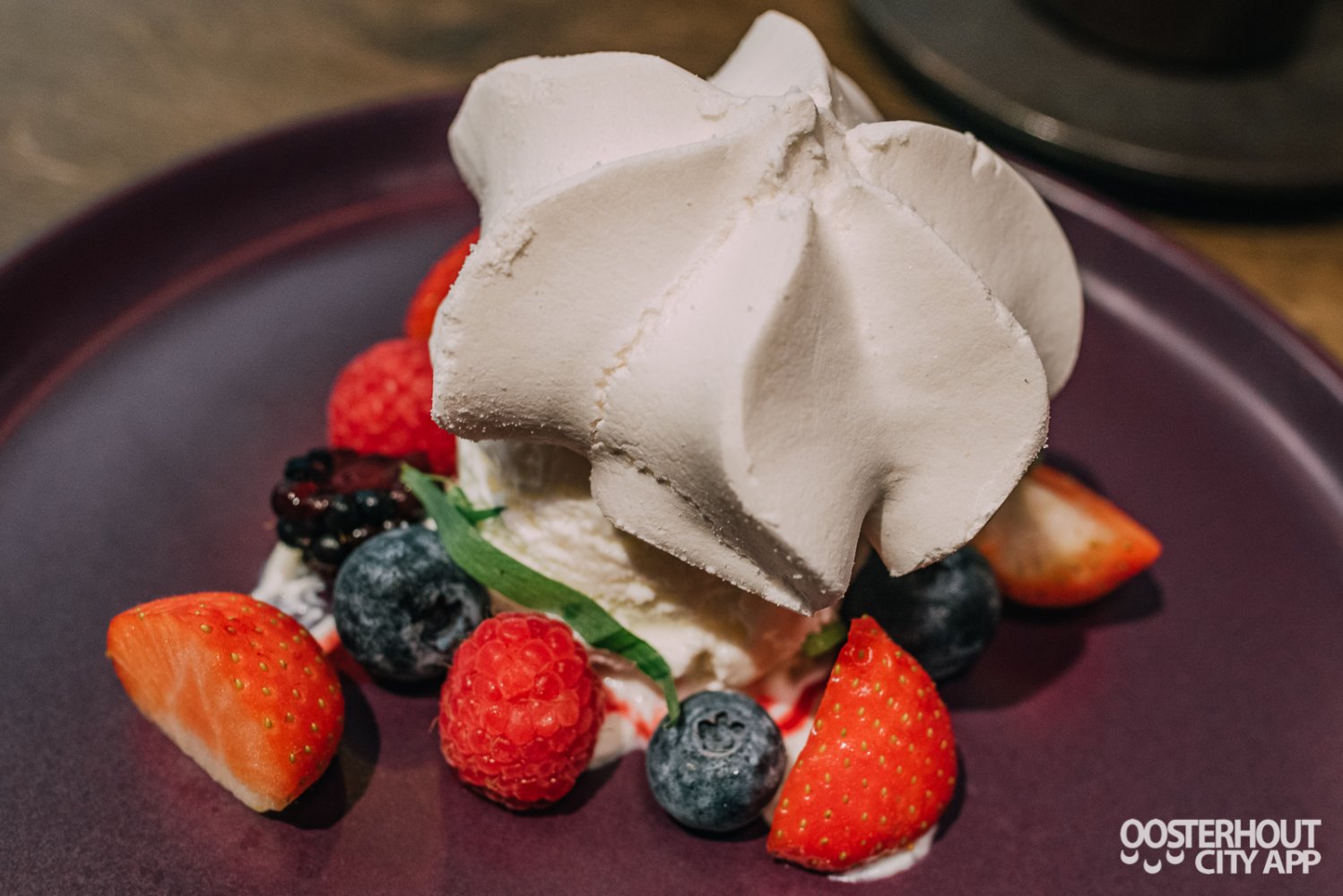 We zijn toe aan het dessert “Merenque rood fruit mascarpone vanille’, vers fruit met milde yoghurt ijs en “Moccacino passievrucht basilicum koffie’ met verrassende samenstellingen van smaken. De kok komt ons het nagerecht brengen. Hij vertelt ons enthousiast dat het voor het team een uitdaging is om smaken uit te proberen en aparte combinaties te maken die je niet verwacht. Wij kunnen beamen dat ze daar zeker in zijn geslaagd.