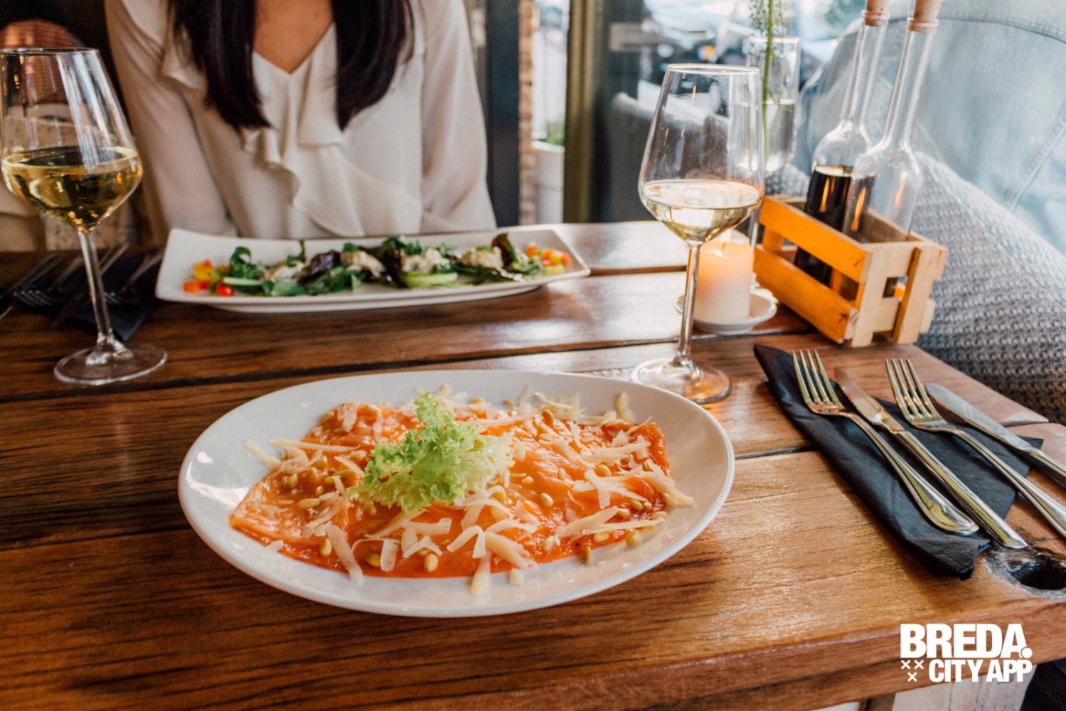 Na dit zoethoudertje neemt mijn foodbuddy de scampi’s in knoflooksaus, geserveerd op een bedje van sla. Ik neem de carpaccio van gerookte zalm, pijnboompitjes en Parmezaanse kaas.