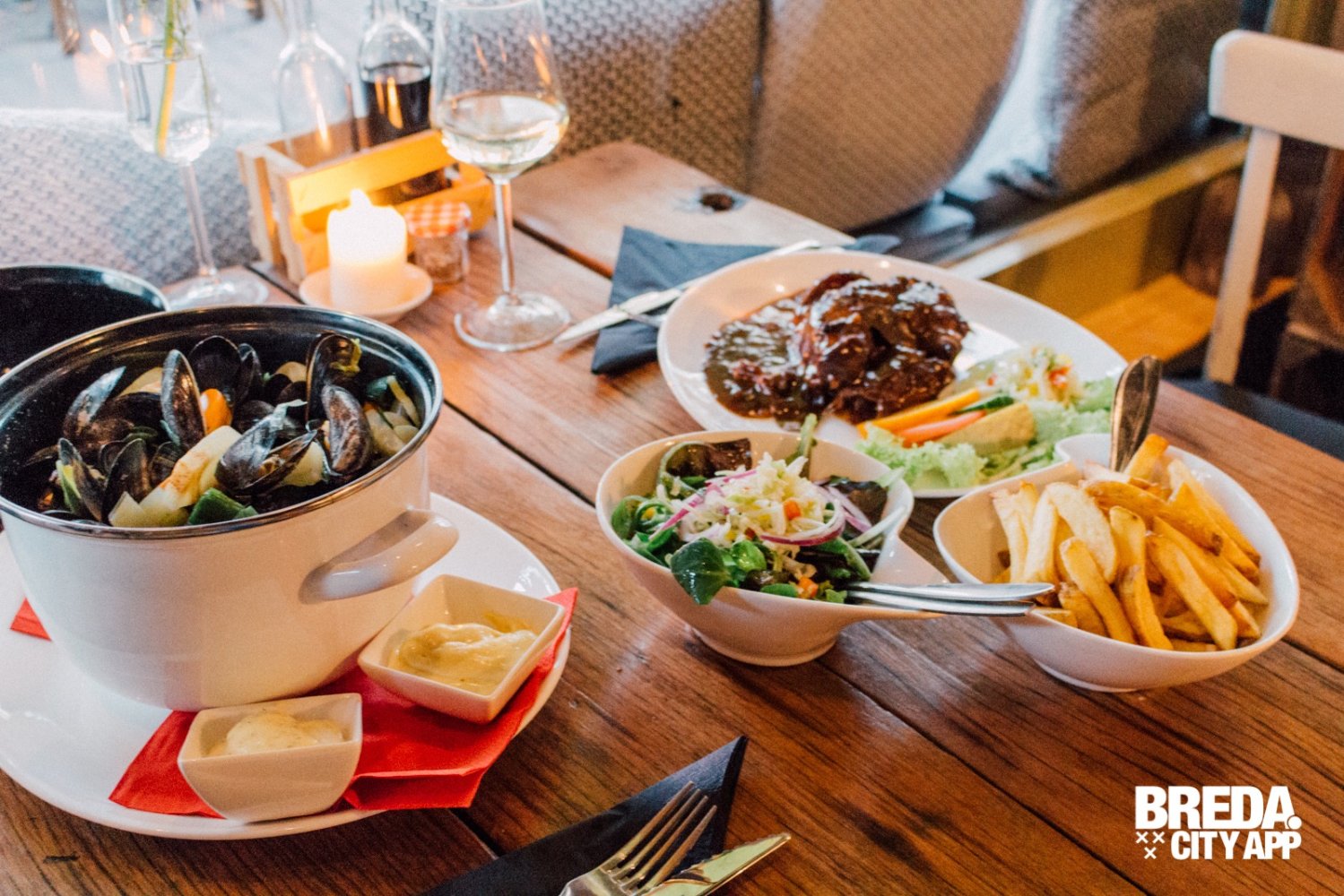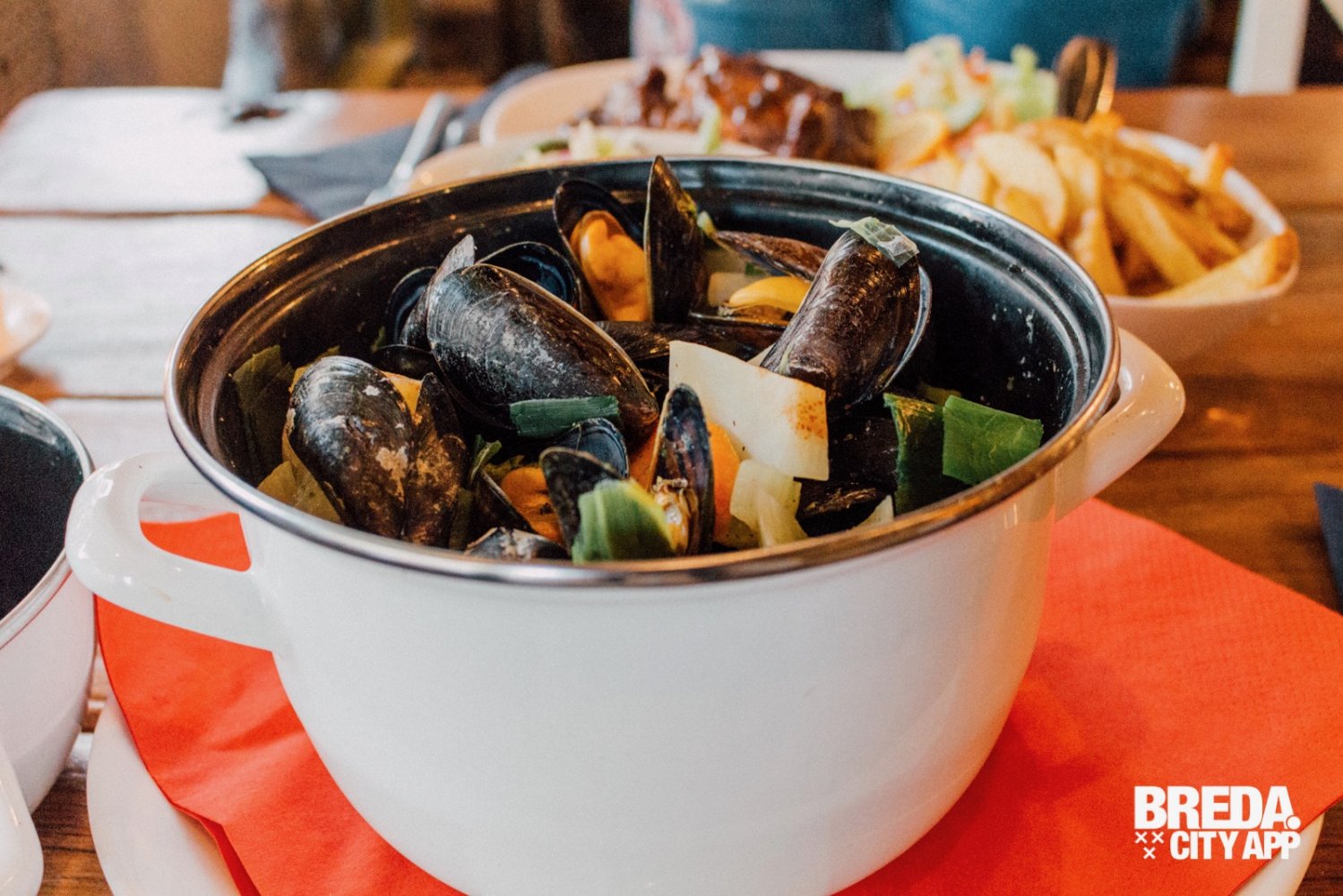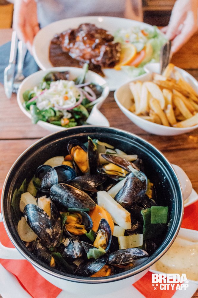 Aan de andere kant staat een pan met mosselen op tafel. Op traditionele wijze gemaakt en boordevol groenten en veel mosselen. Mijn foodbuddy krijgt er geen genoeg van! Dat komt voor haar goed uit. Bij De Overkant organiseren ze regelmatig een avond onbeperkt mosselen eten.