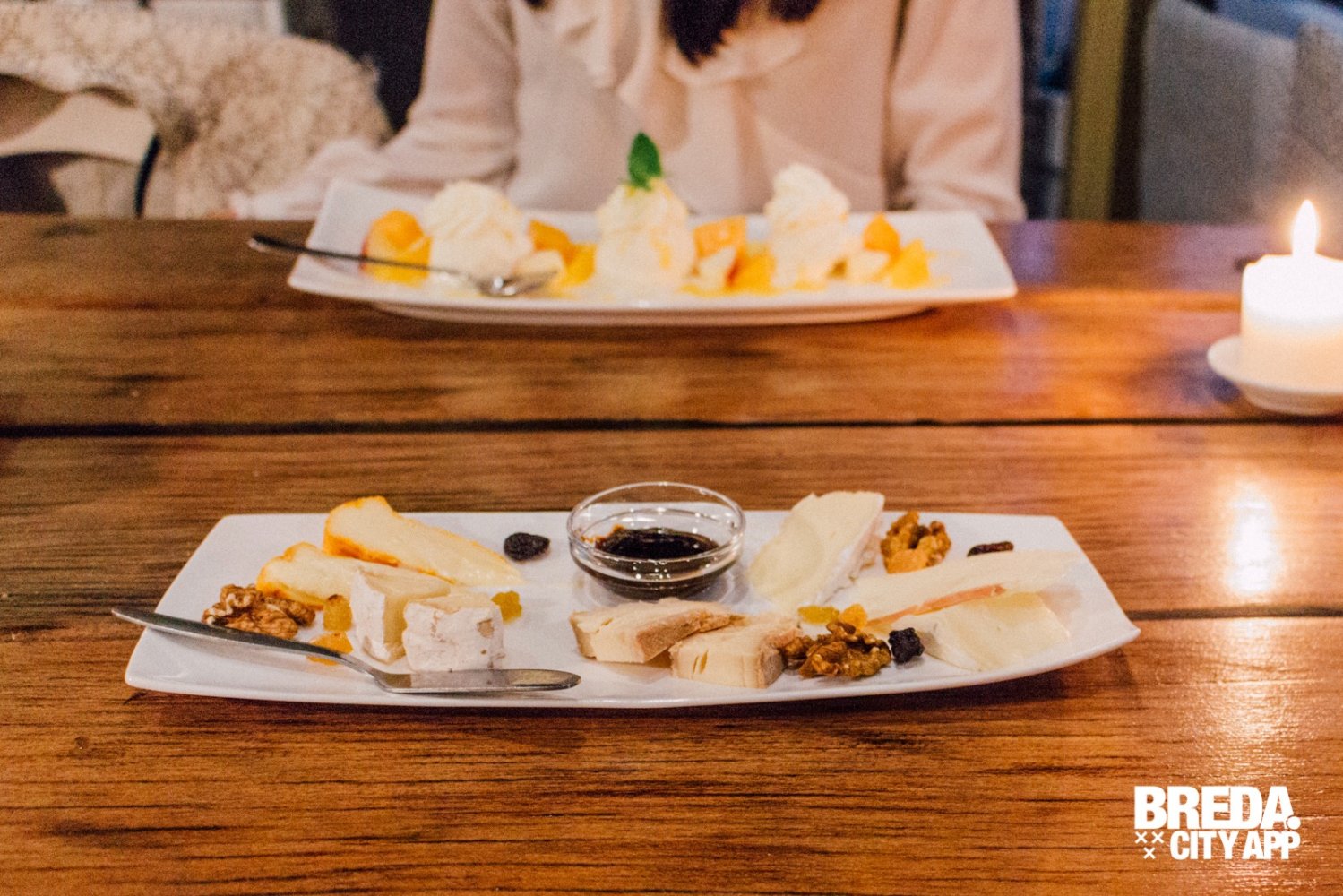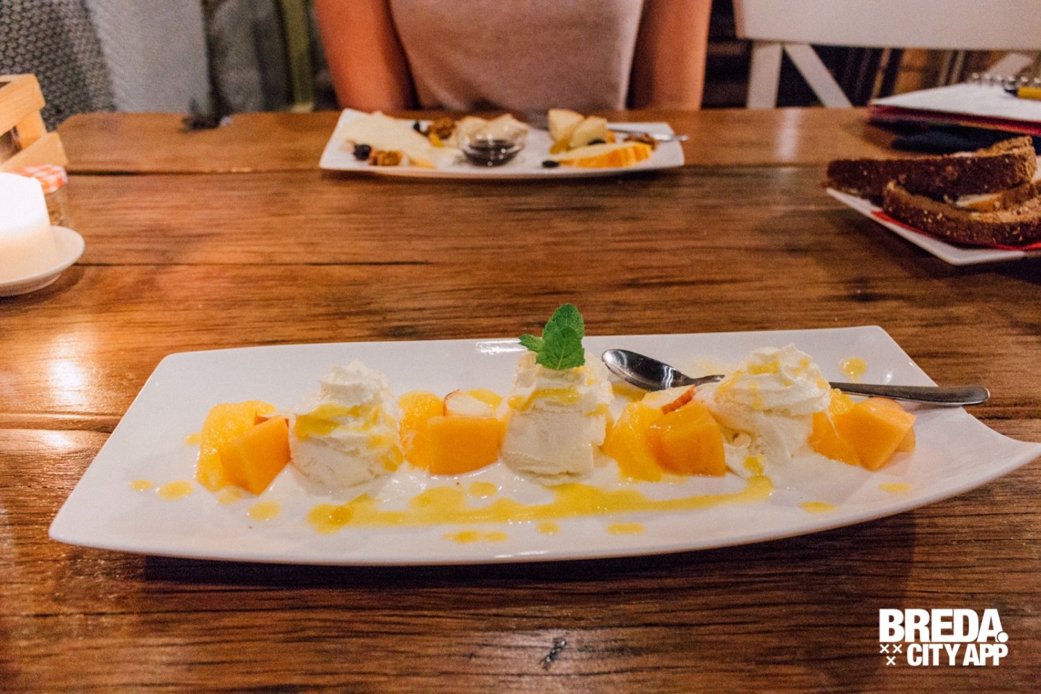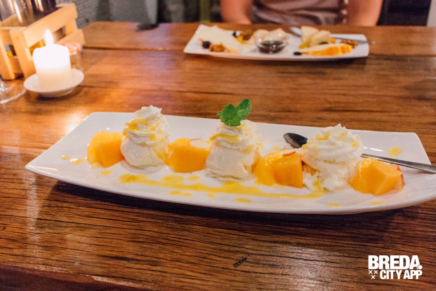 Voordat het einde van ons diner nadert, willen wij nog een nagerecht proeven. Ik ga voor vanille-ijs met vers fruit en mangosaus. Altijd een veilige en goede keuze. Mijn foodbuddy neemt le fromage; een kaasplankje met kazen in alle smaken, vormen én geuren. Een smakelijk einde van ons etentje.