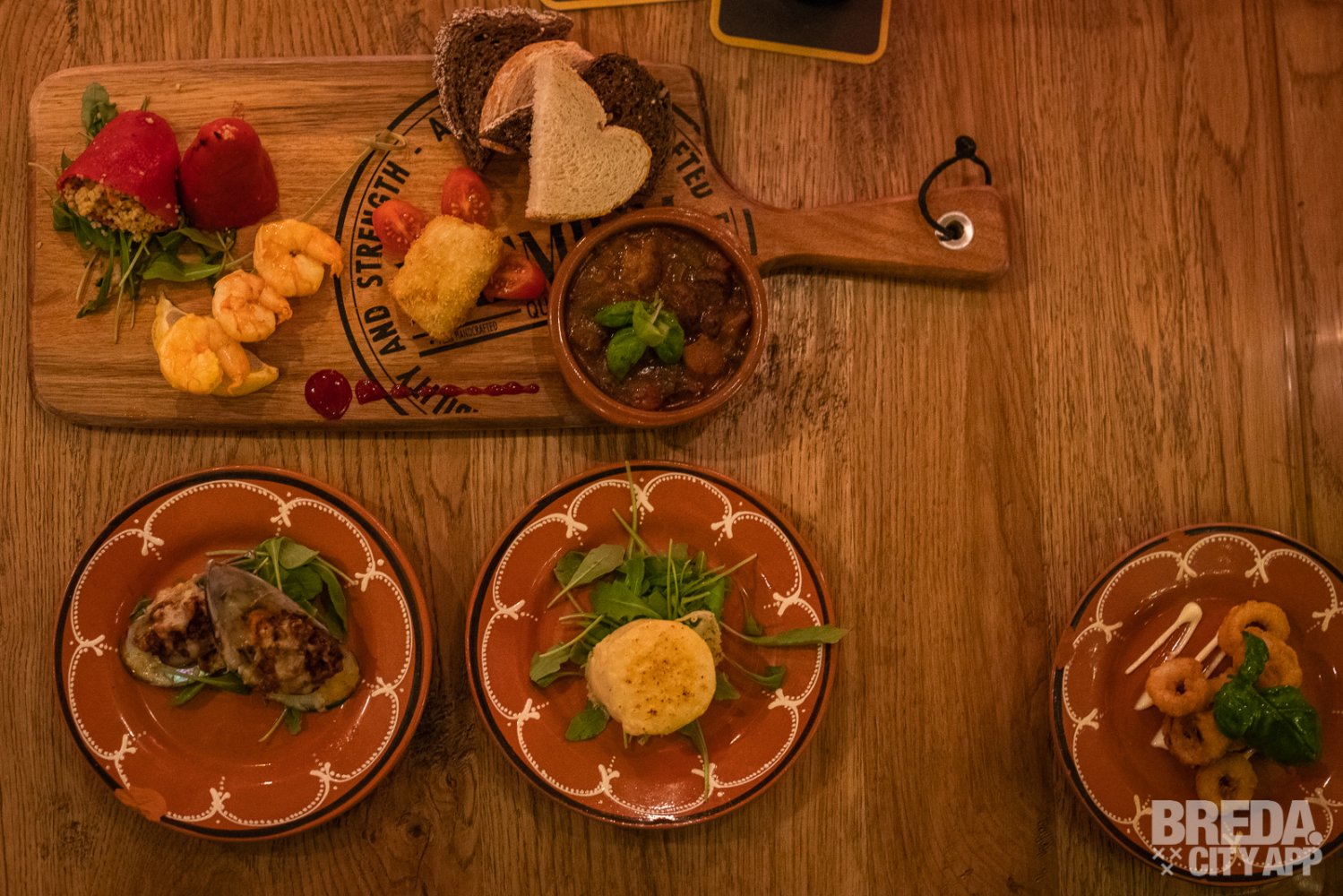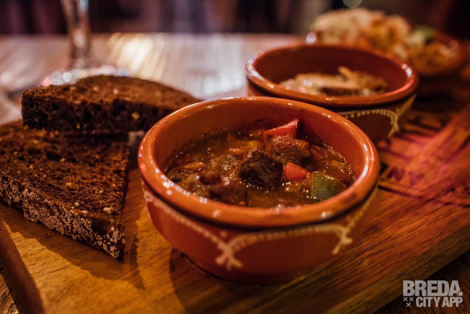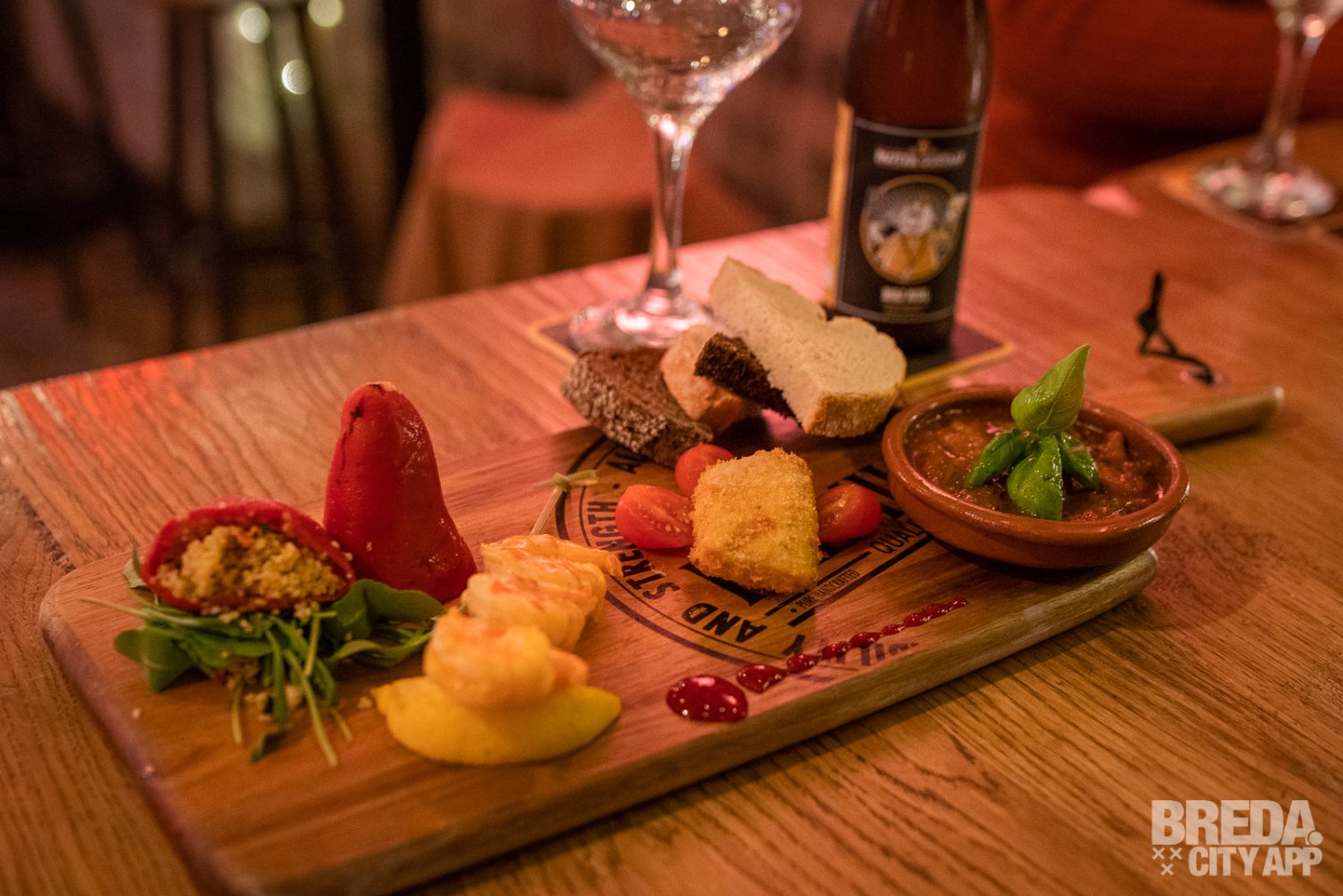Na een ronde koude tapas worden we verblijd met een plankje met ‘van alles en nog wat’. Geroosterde paprika met couscous, gepaneerde brie, een gamba spiesje en een wildzwijn goulash. Allemaal gerechtjes van de nieuwe kaart, wat ons betreft zeker blijvertjes! Met name de gepaneerde brie en de wildzwijn goulash zijn favoriet.