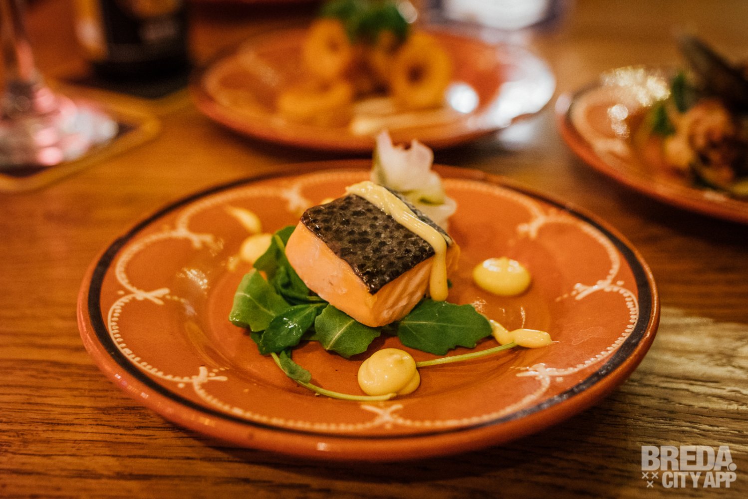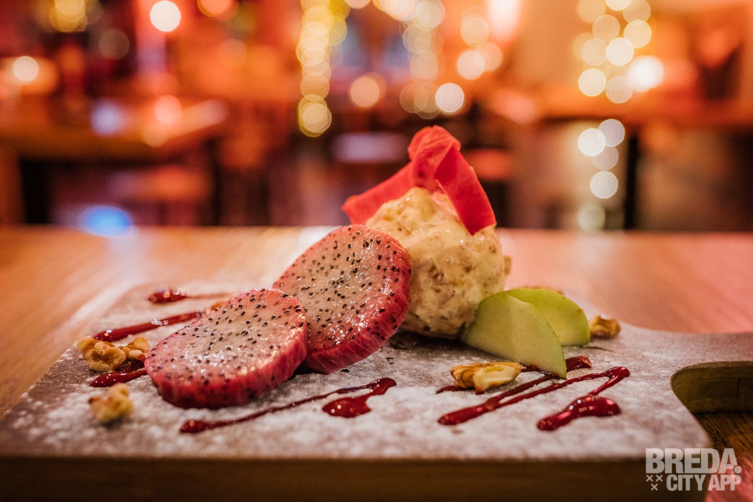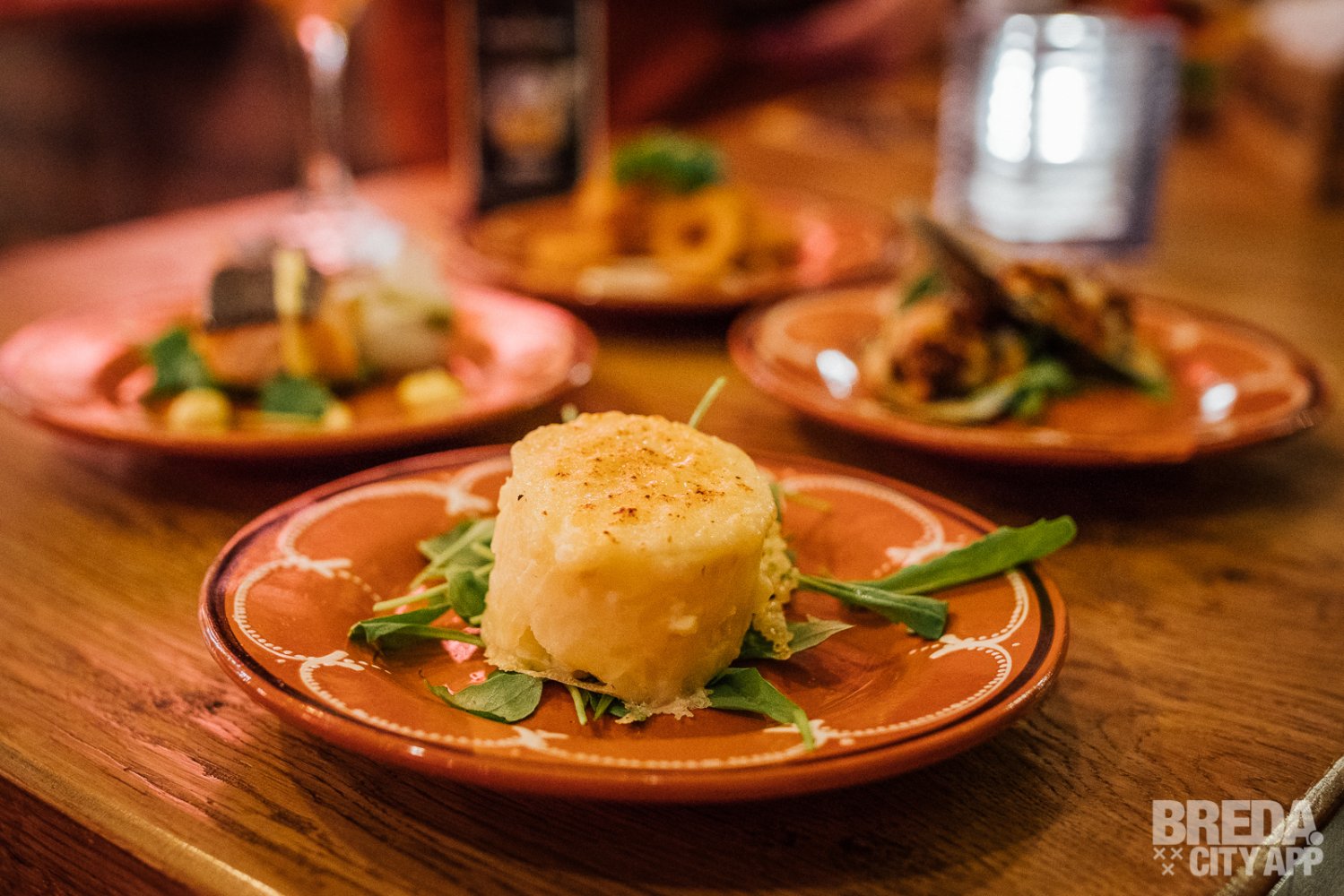 Na een ronde koude tapas worden we verblijd met een plankje met ‘van alles en nog wat’. Geroosterde paprika met couscous, gepaneerde brie, een gamba spiesje en een wildzwijn goulash. Allemaal gerechtjes van de nieuwe kaart, wat ons betreft zeker blijvertjes! Met name de gepaneerde brie en de wildzwijn goulash zijn favoriet.