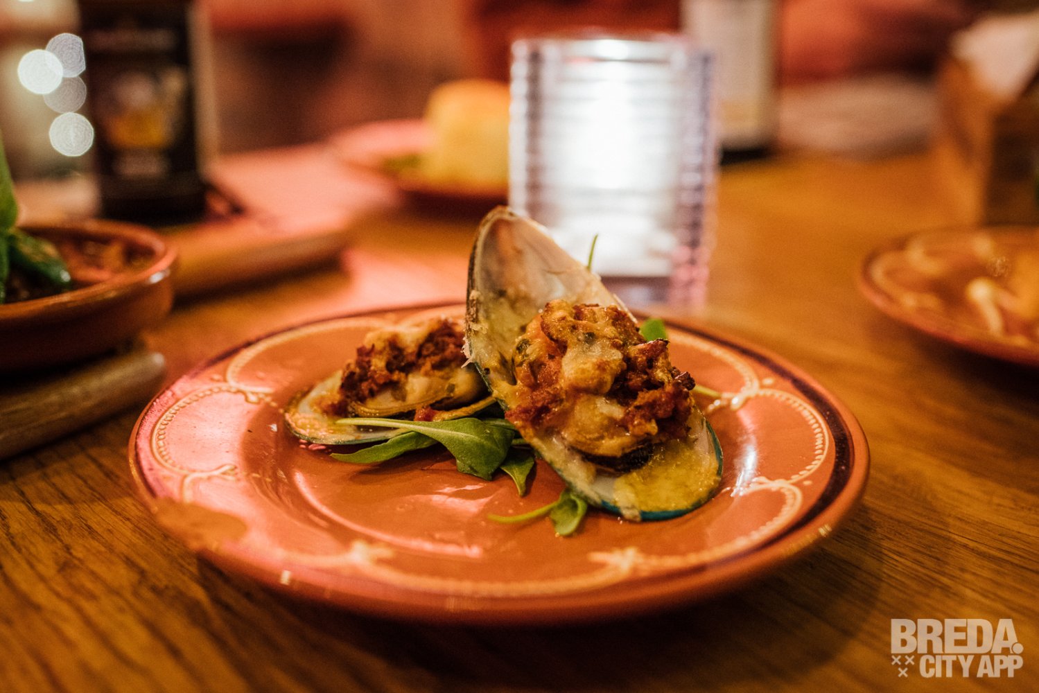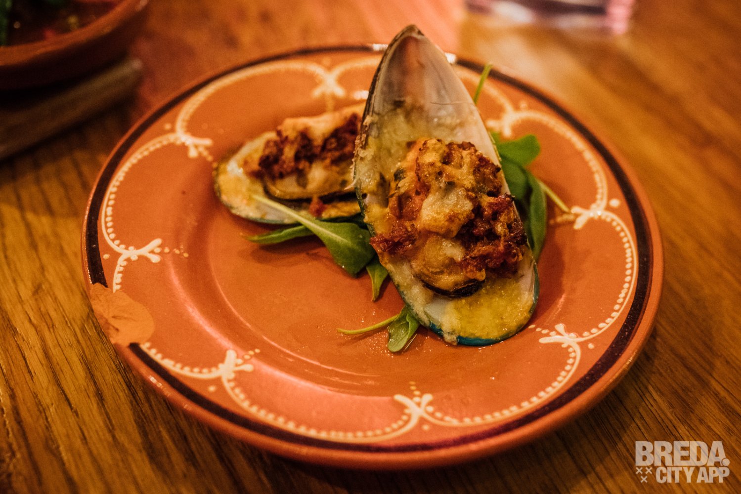 De vorige ronde is nog maar net gearriveerd of er komen al weer wat nieuwe gerechtjes aan. Het leuke aan tapas eten vinden wij dat je alles kunt delen, lekker veel kunt proeven en dat er continue nieuwe gerechtjes op tafel verschijnen. De mossel met tomaat en parmezaan ziet er veelbelovend uit, eveneens een nieuw gerecht welke goed op smaak is!