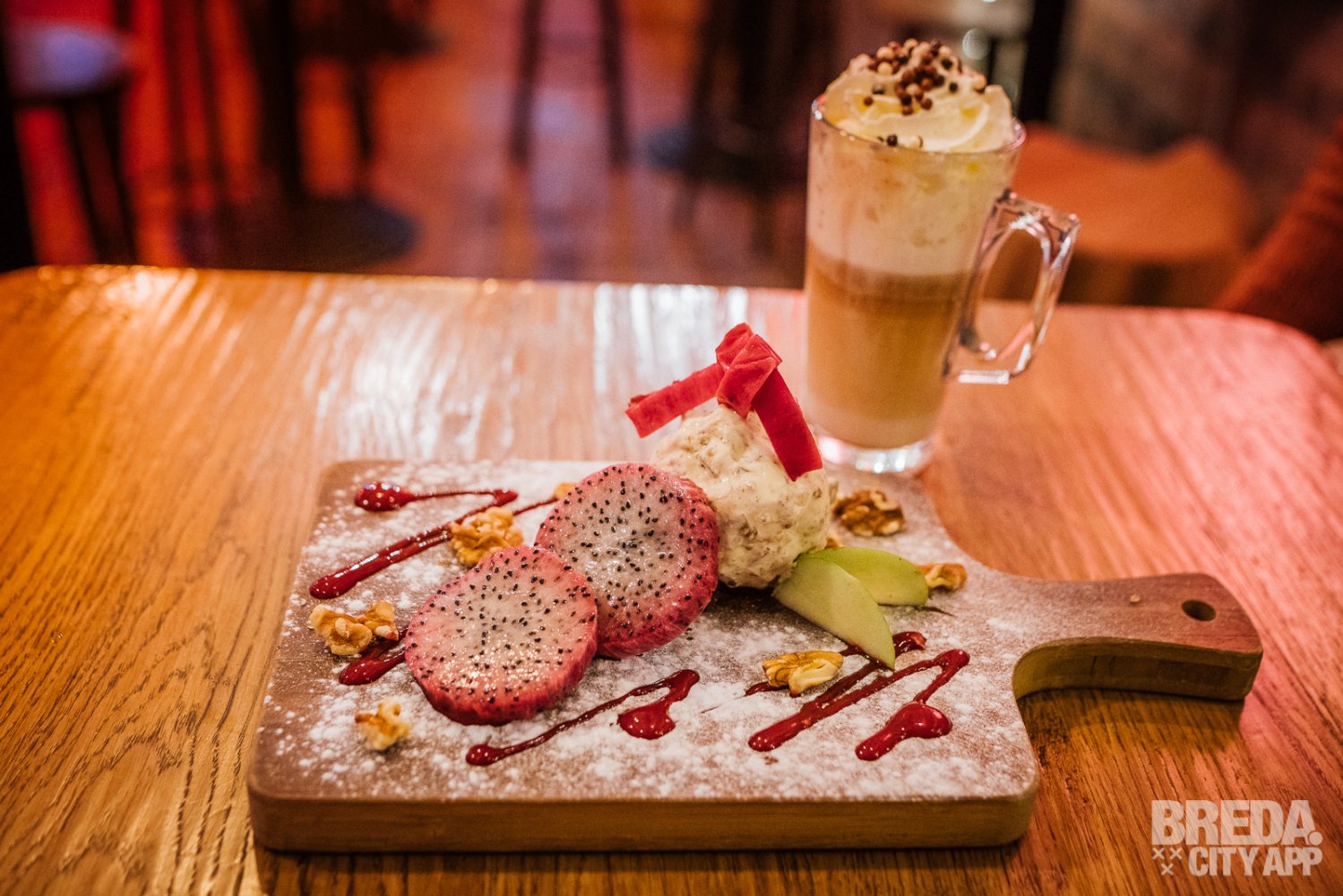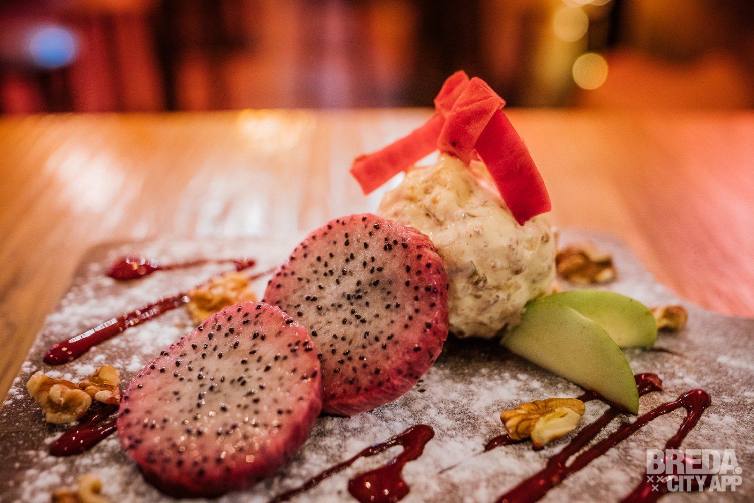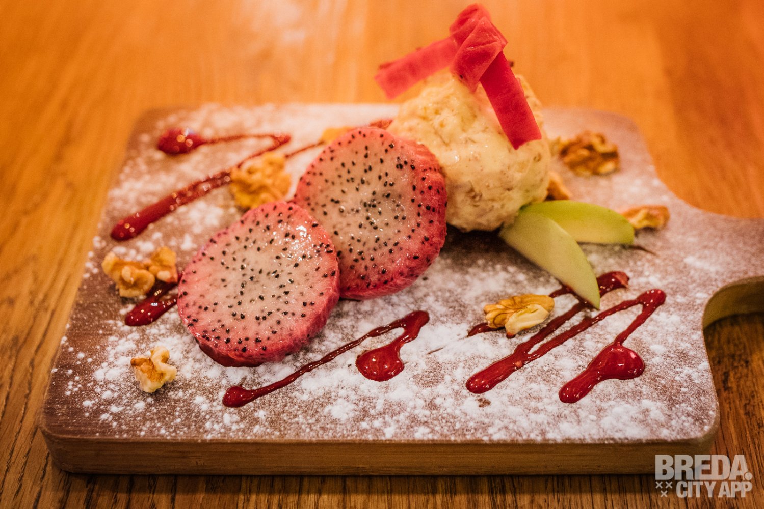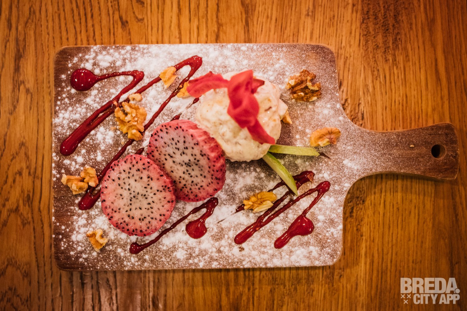 We zouden geen échte foodies zijn als we na deze kaasplank niet toch nog een klein beetje zin zouden hebben in een toetje. We besluiten er een te delen en laten ons wederom adviseren. De semifreddo met peer en walnoot is een plaatje om te zien. Een perfecte afsluiter, niet te zoet en niet te zwaar.