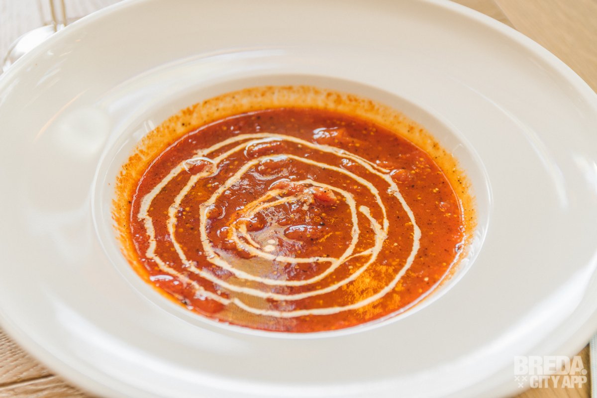 Na dit aangename voorgerecht hebben wij natuurlijk trek in meer gekregen! We krijgen een pomodori soep met grove mosterd, truffel en créme fraiche. Hierbij komt een mooie Zuid-Afrikaanse wijn. De Zonnebloem Pinotage Stellenbosch heeft een stevige smaak, doordat de wijn rijpt op eikenhouten vaten. Ook heeft de wijn hints van kersen, zwarte bessen, kruiden als nootmuskaat, vanille en peper.