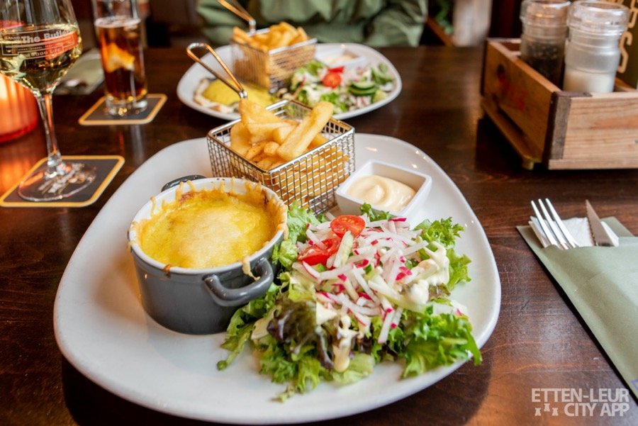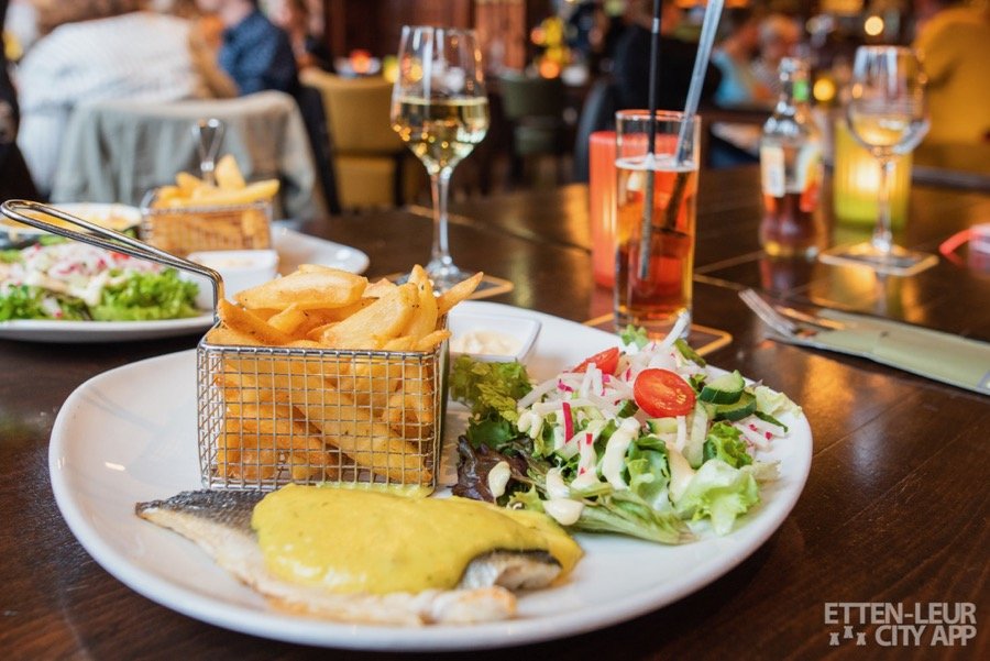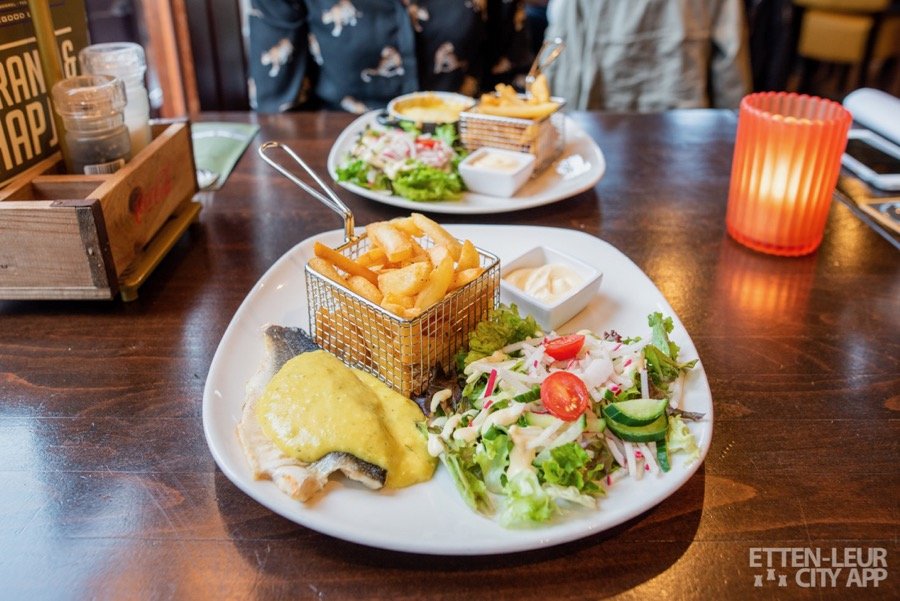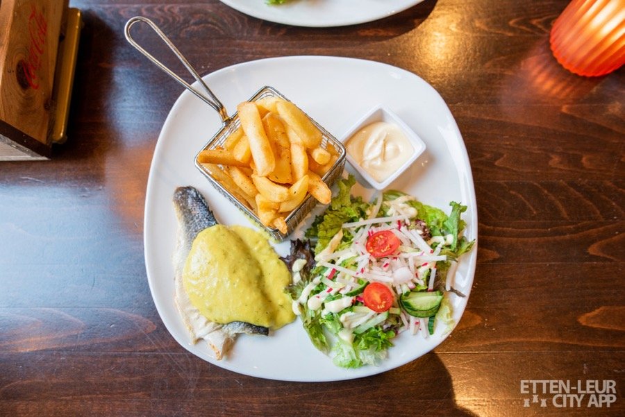 Voor de tweede gang krijgen wij de tip te gaan voor de zeebaars seizoenaanbieding. Deze is mooi gebakken op de huid met een romige vissaus. Ook het gegratineerde vispannetje bleek een goede keuze. Het heeft een heerlijk knapperig, met kaas gegratineerde bovenkant met daaronder scampi’s en kabeljauw gekookt in een smaakvolle vissaus. Wat ons direct opvalt is de gezellige opmaak van de borden. We kiezen als bijgerecht voor gekruide frietjes, die in een klein frietnetje geserveerd worden met een frisse radijs- en komkommersalade.