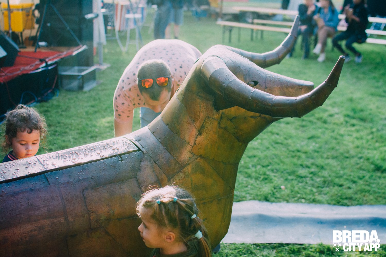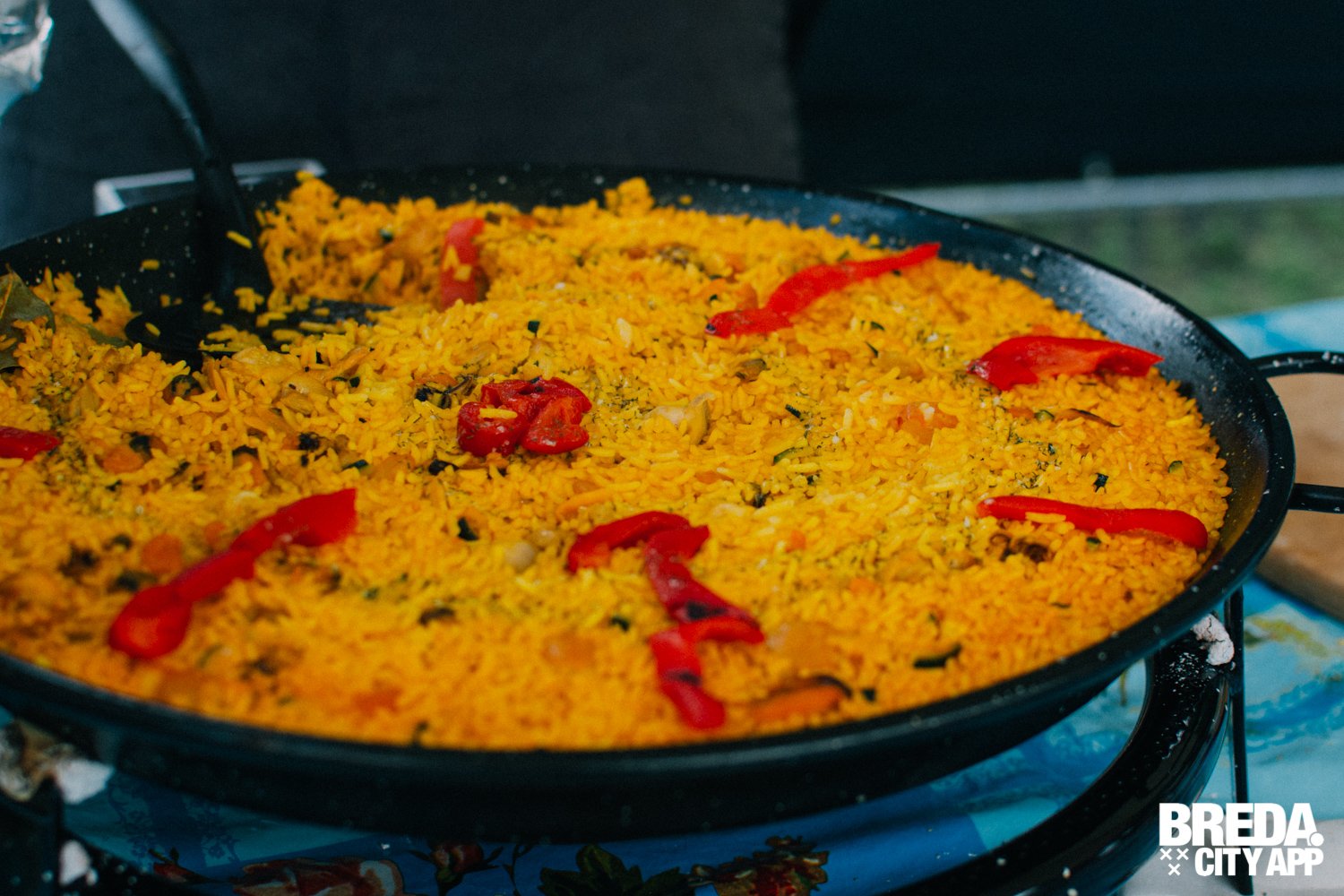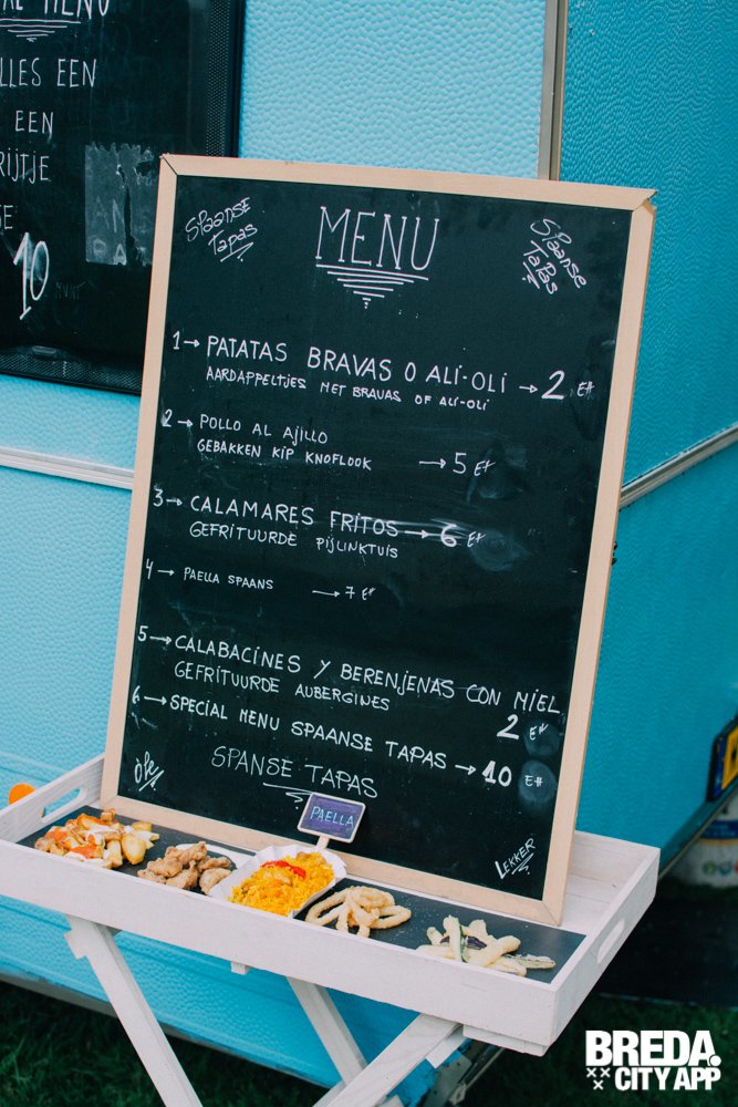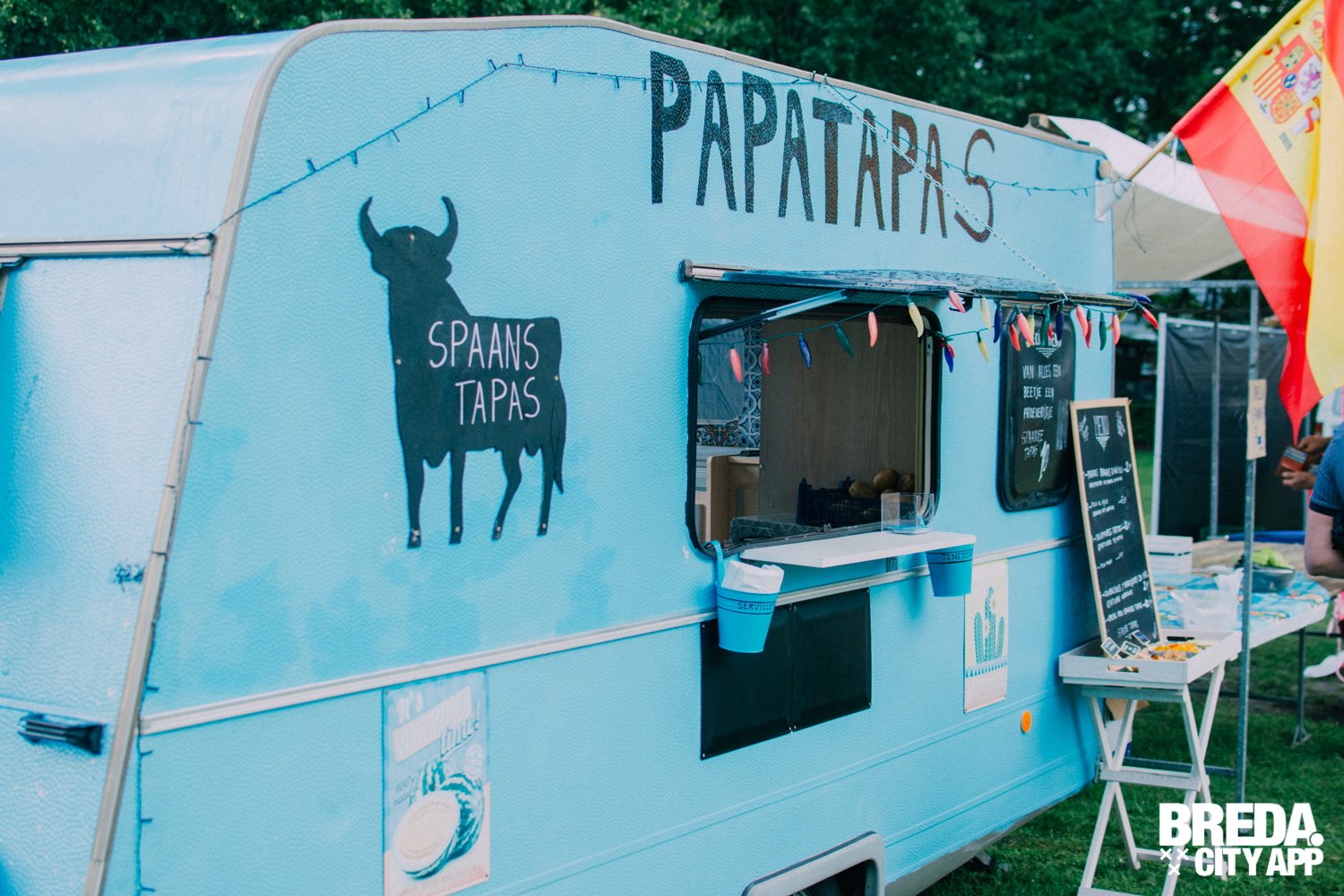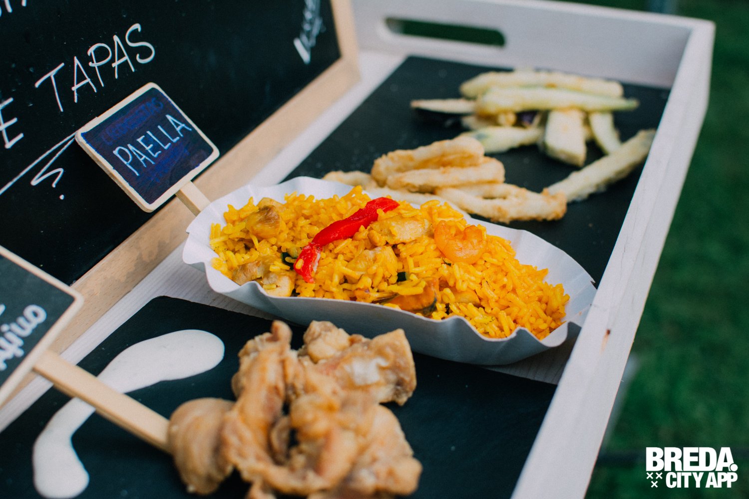 Bij aankomst op het terrein kwam ons meteen al gezellige livemuziek tegemoet, en de eetkraampjes zorgden voor die heerlijke geur die enorm welkom is wanneer je om half 7 ontzettend trek hebt. De lucht was opgeklaard en er scheen een heerlijk zonnetje op het park. Tijd voor wat lekkers! Onze aandacht werd meteen getrokken door de Spaanse foodtruck Papatapas, die, zoals hun naam al verklapt, verschillende tapas aanboden. Zelf hadden we gekozen voor de patatas ali-oli, gebakken aardappelschijfjes met een lekkere saus. Ze hadden ook een leuk tapas menu, waarbij je alle gerechtjes kon proeven: gebakken kip met knoflook, gefrituurde pijlinktvis, gefrituurde aubergines etc. Ook de paella liefhebbers kunnen bij deze foodtruck terecht: bij de keuken stond een grote pan paella op te warmen.