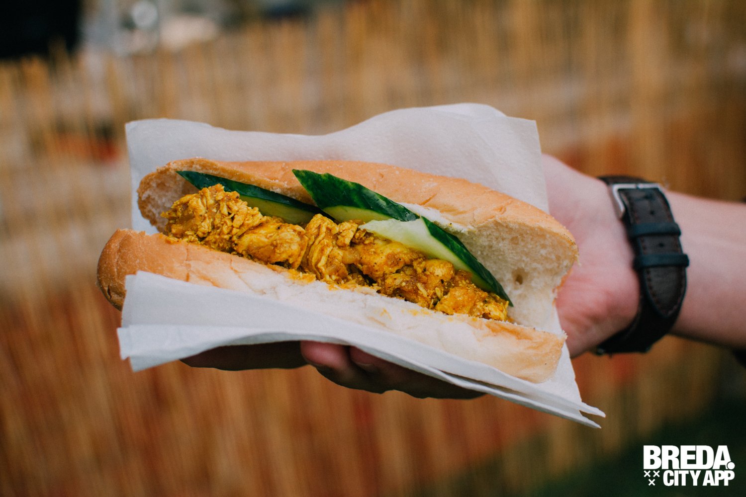 Maar hé, we waren natuurlijk nog lang niet uitgegeten! We waren toch niewsgierig naar wat voor lekkers de Asian streetfood kraam nog meer te bieden had. Al snel hadden we de keuze gemaakt: een goed gevuld broodje met kip, kruidige kerrie en schijfjes komkommer (want kip = life natuurlijk). Ook de andere broodjes met bijvoorbeeld zoete kip zagen er smakelijk uit.