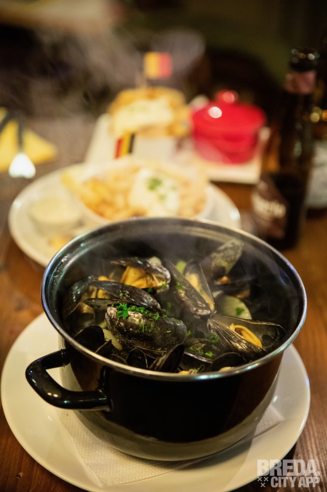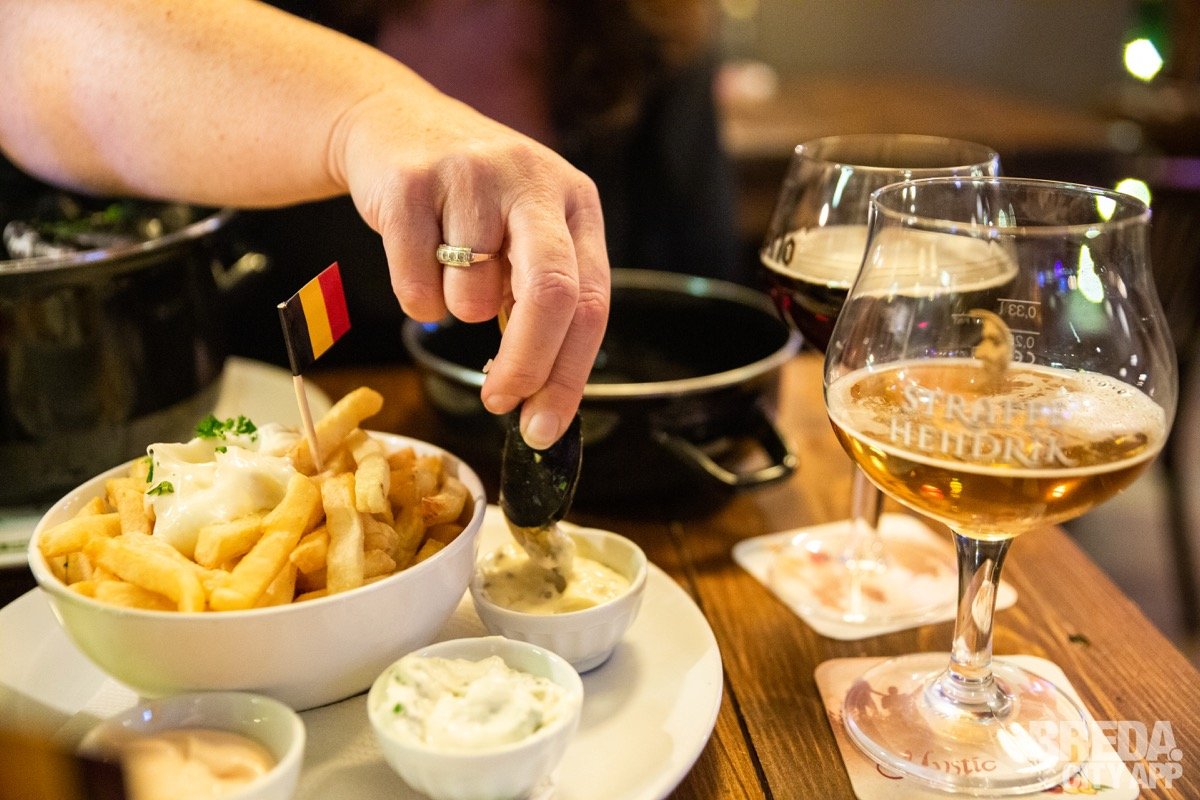 Wij gaan voor de mosselen en natuurlijk de friet stoofvlees. De mosselen zijn er in diverse varianten, wij kiezen de mosselen op ‘Antwerpse wijze’, bereid met een flinke scheut Elixer d’Anvers, een zalige Antwerpse likeur. We drinken er een frisse droge ‘Schelde Zeezuiper’ bij, een goede combinatie.