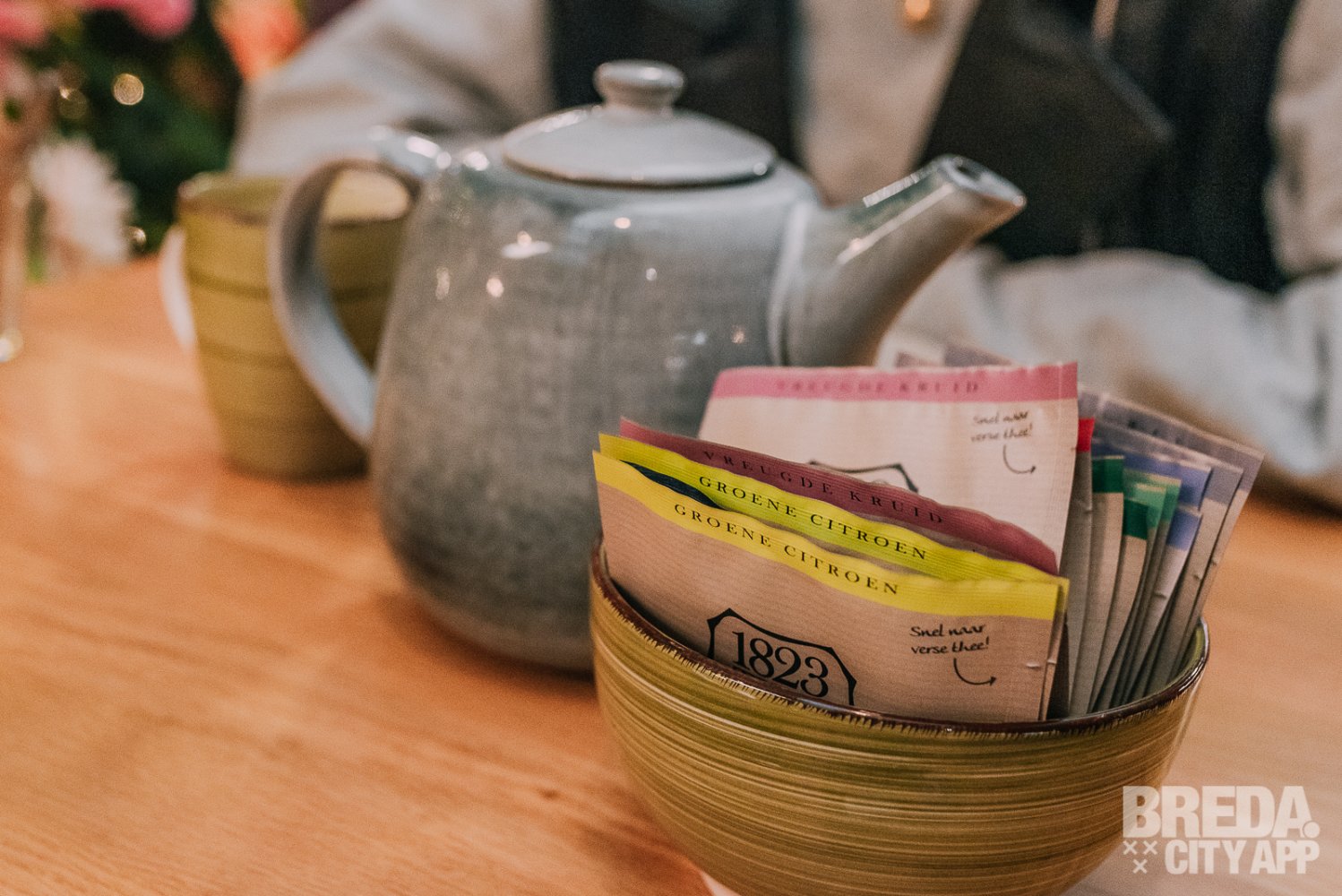 Al snel kregen we een grote pot met thee op tafel met heel veel verschillende smaken, de thee werd geserveerd in zakjes waar de smaken op stonden. We kozen voor een heerlijke thee met rooibos, die rook verrukkelijk. We zijn nu al aan het genieten!