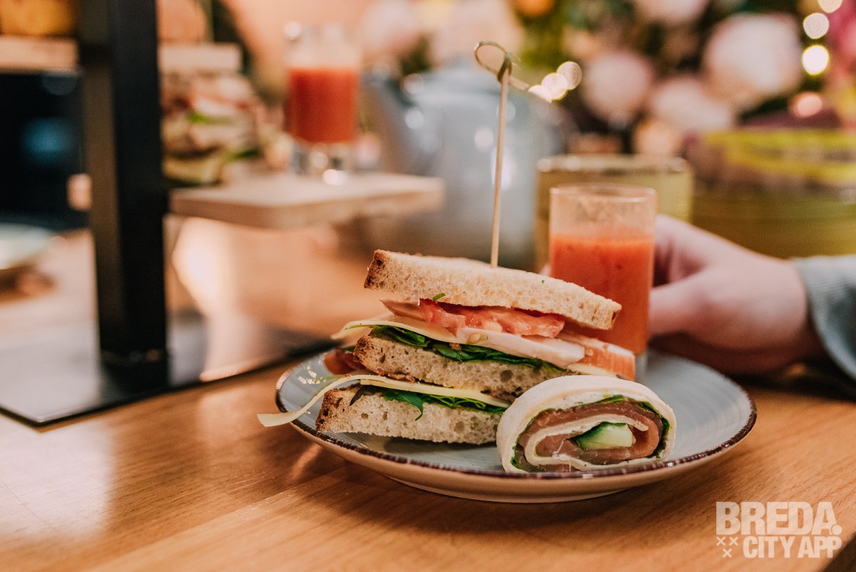 De eerste ronde van de high tea is hartig. We krijgen een grote etagere vol hartige lekkernijen. Het allereerste wat ons opvalt is de clubsandwich, deze ziet er overheerlijk uit. Het water loopt ons in de mond. Verder liggen er op de plank ook 2 verschillende wraps, eentje met carpaccio en een met zalm. Smullen maar! Ook wordt er een mini tomatensoepje bij geserveerd en konden we genieten van een saucijzenbroodje, quiche, hartige muffin en een worstenbroodje. Dit was allemaal enorm lekker! De hartige ronde was meer dan geslaagd.